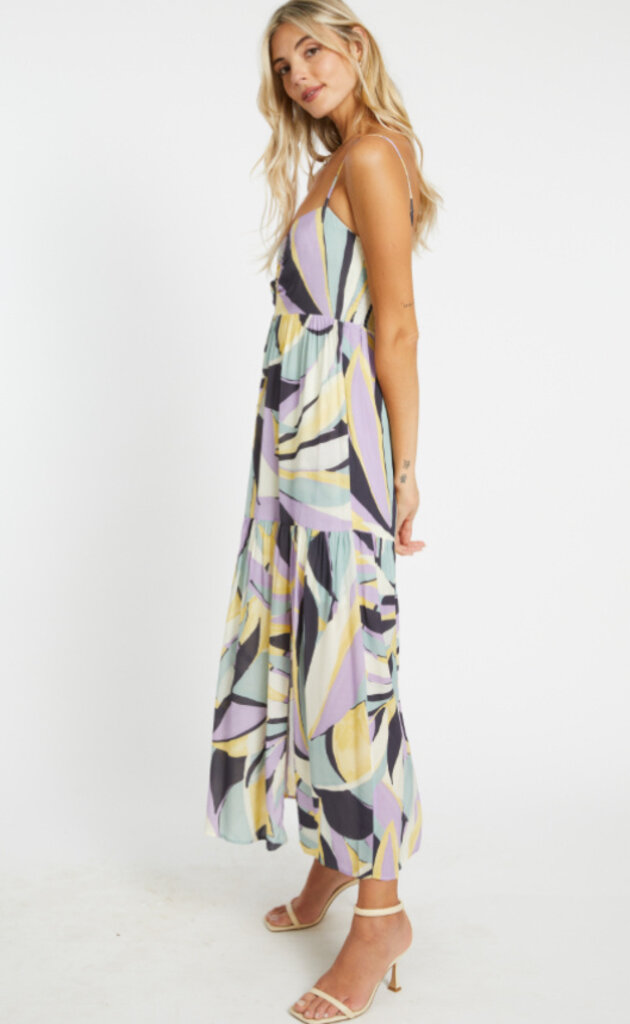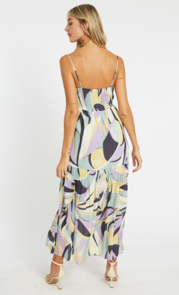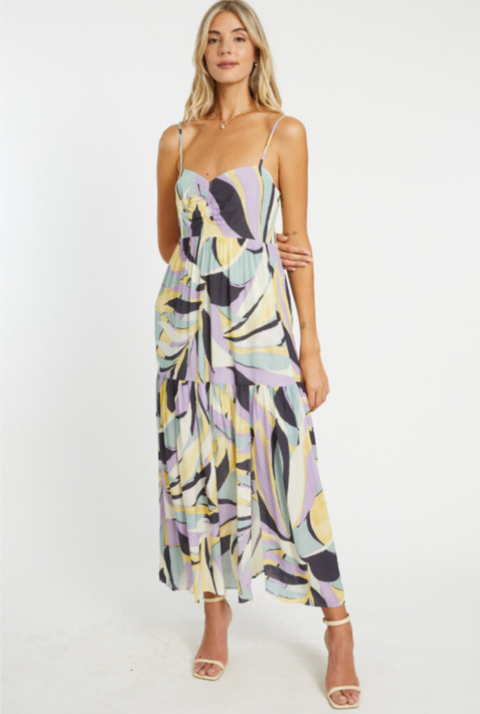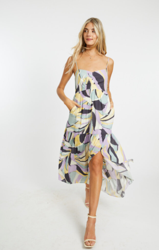 A soft, tiered skirt adds beautiful movement, while a side slit gives it an easy, flowing feel. With its fresh leafy print in shades of lilac, sage, yellow, and a bold charcoal hue, the Isla Dress is perfect for summer days, beach getaways, and everything in between.