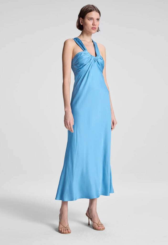The Ivy Dress is crafted from fluid viscose in a vivid sky-blue hue. This midi dress features a twisted halter neckline, a fitted bodice with gathered detailing, and a soft A-line skirt offering captivating, fluid movement.