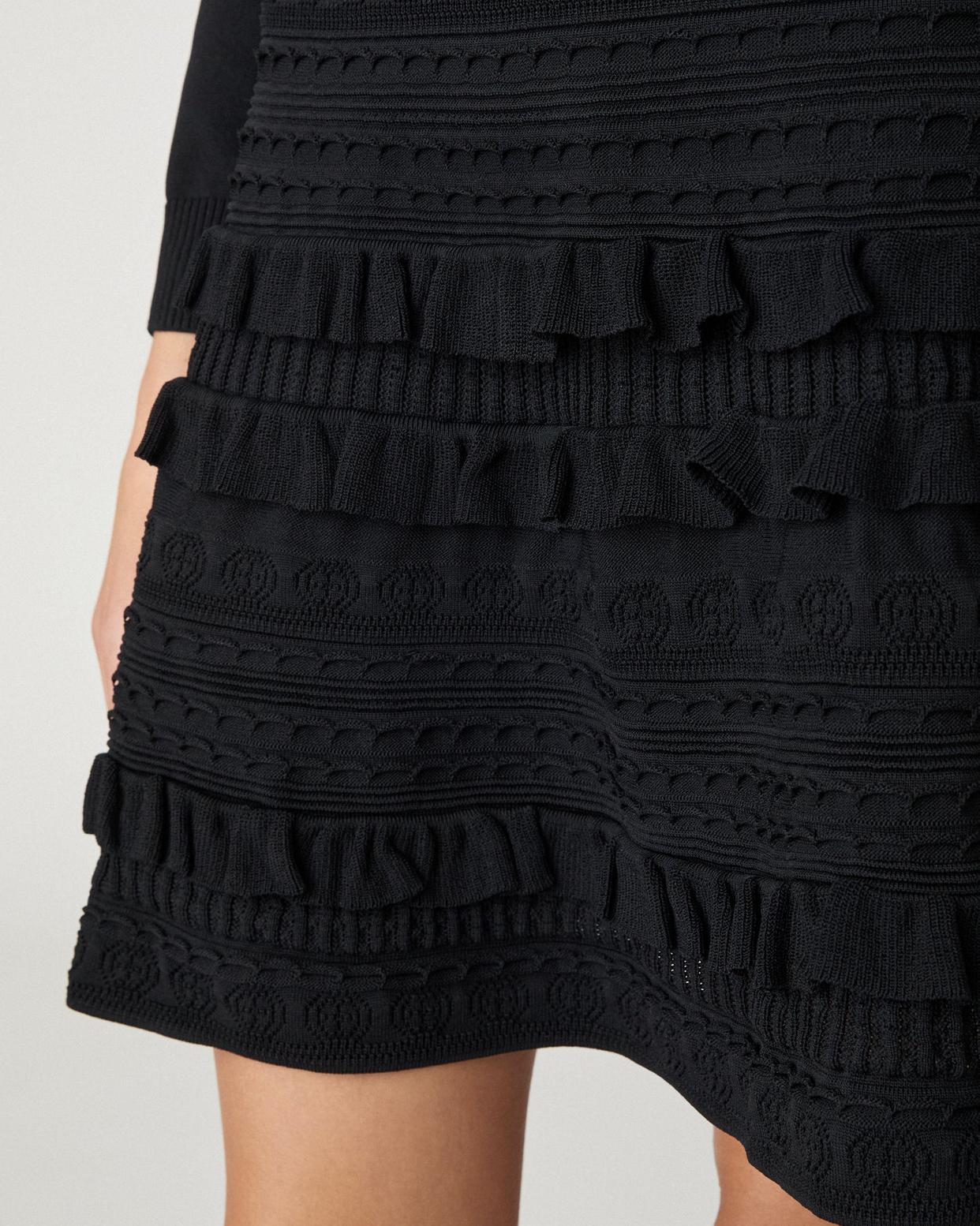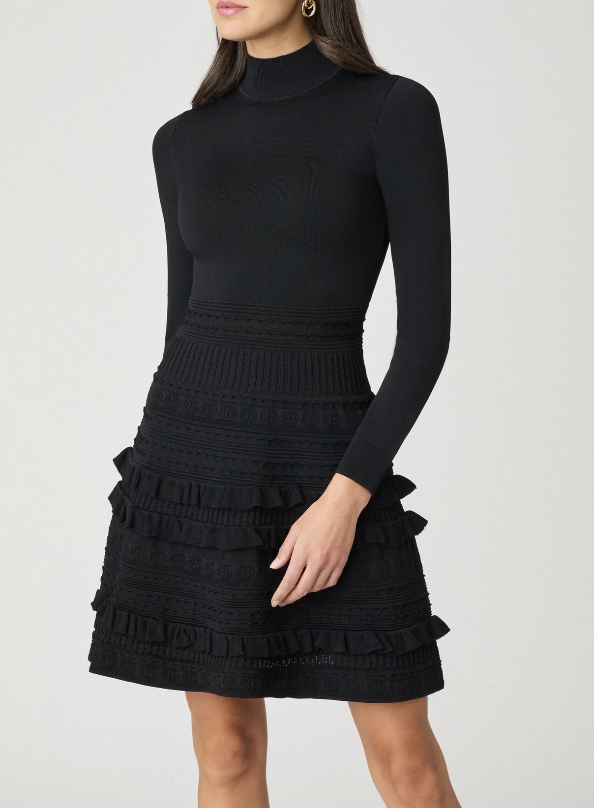 Cute signature Shoshanna knit dress, with a mock neckline and fitted full-length sleeves. Bodice is sleek and fitted, with a flared skirt featuring intricate tipping and ruffle details. Unlined.