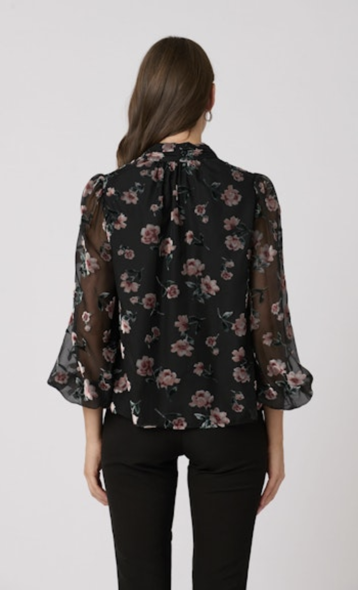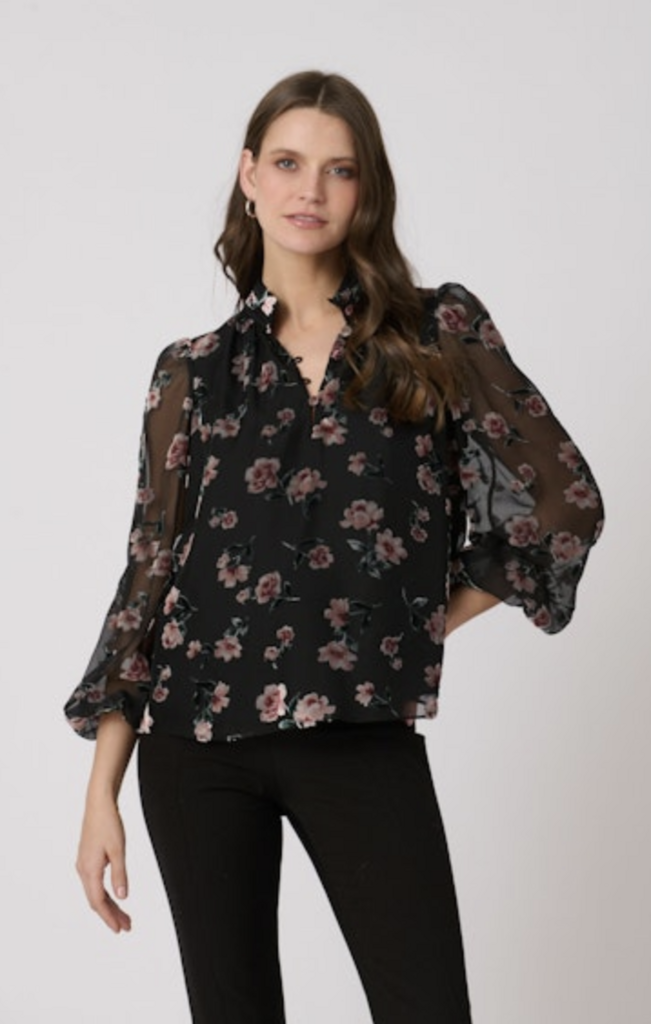 This fabulous burnout velvet top features a ruched collar and a front slit with covered buttons and loops. Buttons are functional and can be closed or left open for desired styling. The body is lined, and the sleeves are unlined for a sheer effect.