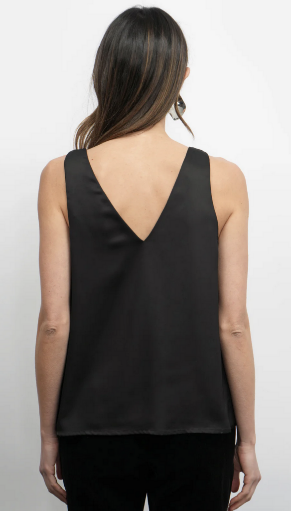 This top is crafted from a soft, lightweight satin-like fabric in a sleek black color. It features a flattering, relaxed fit with a round neckline.