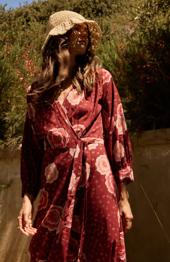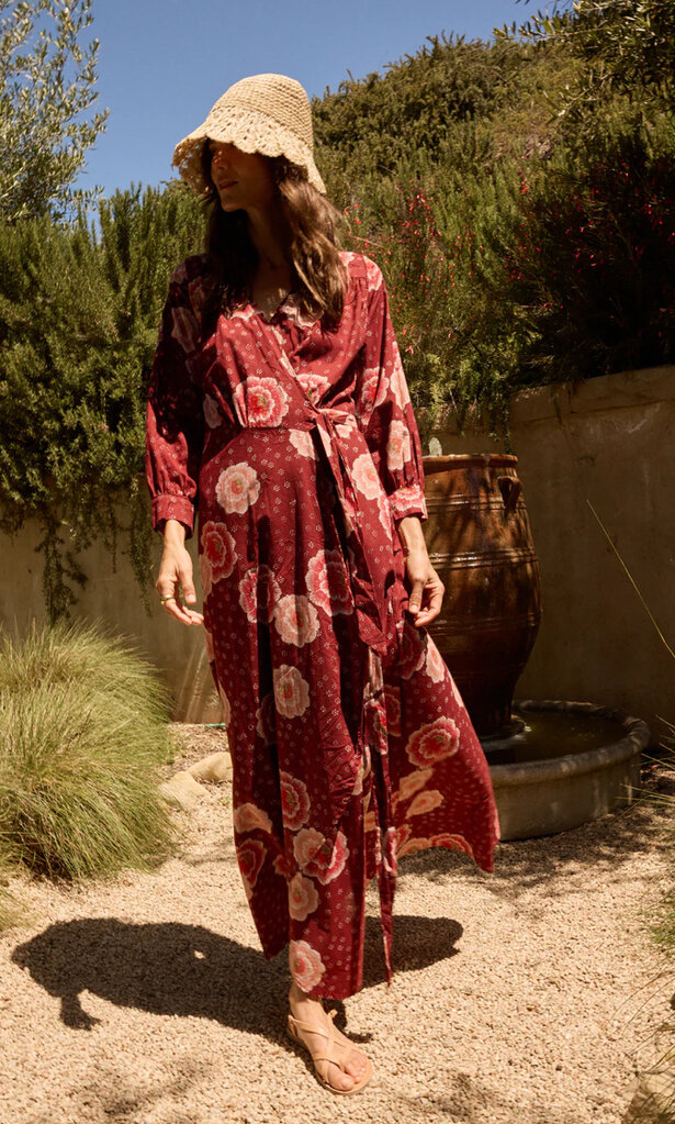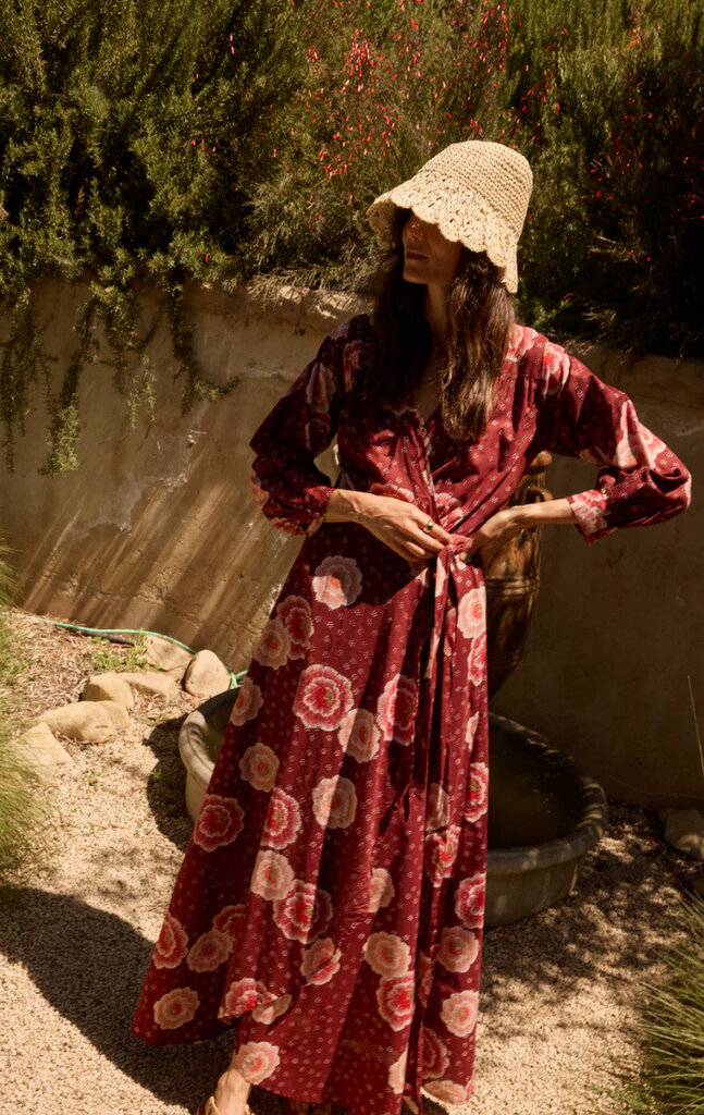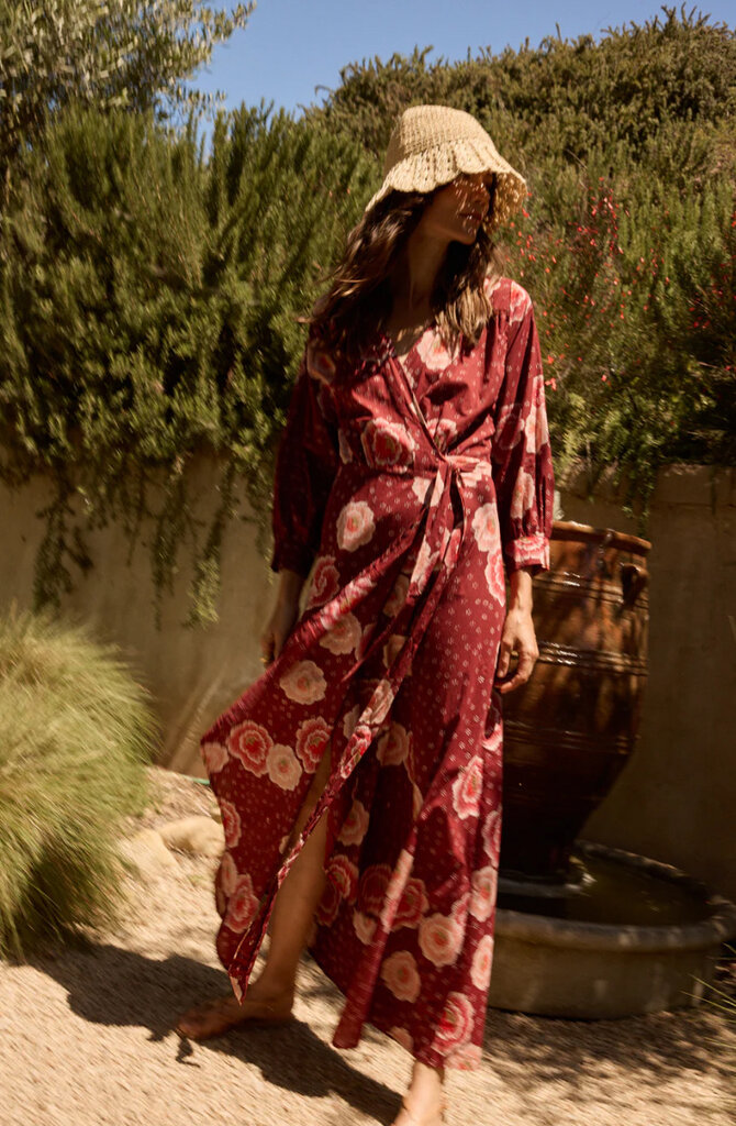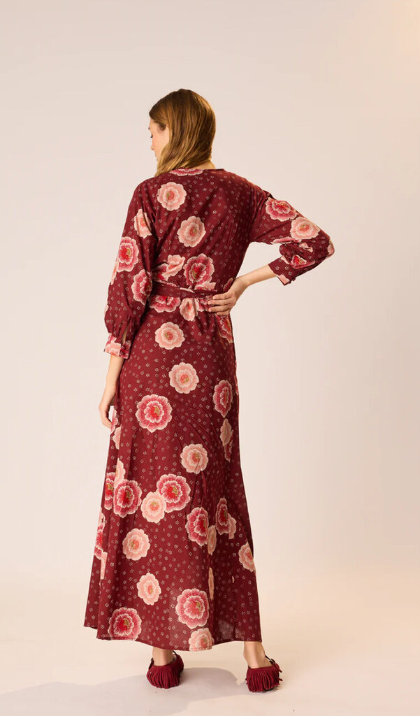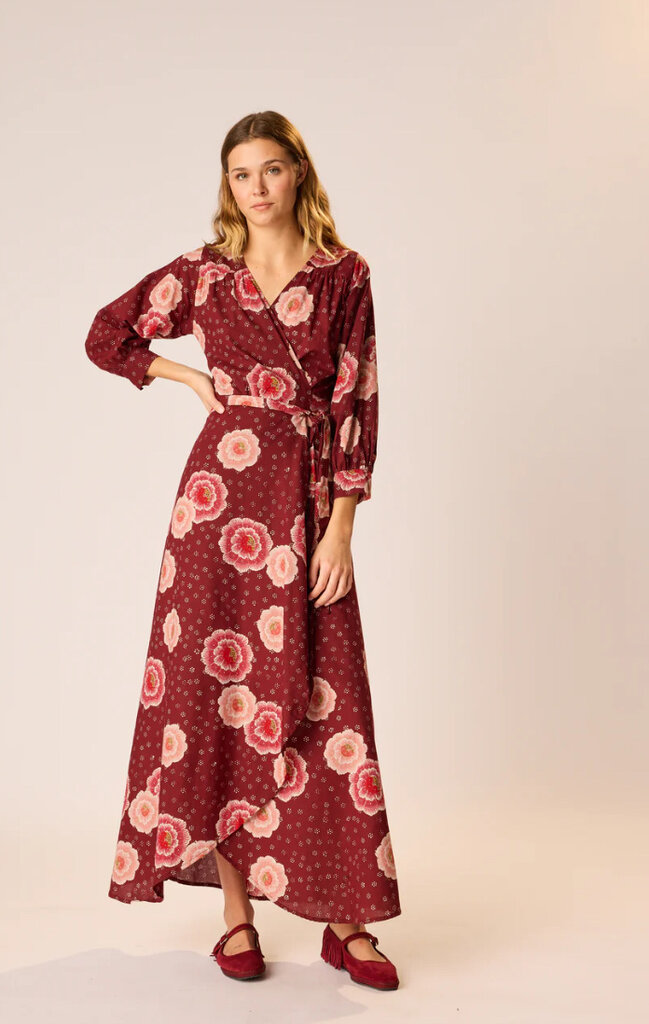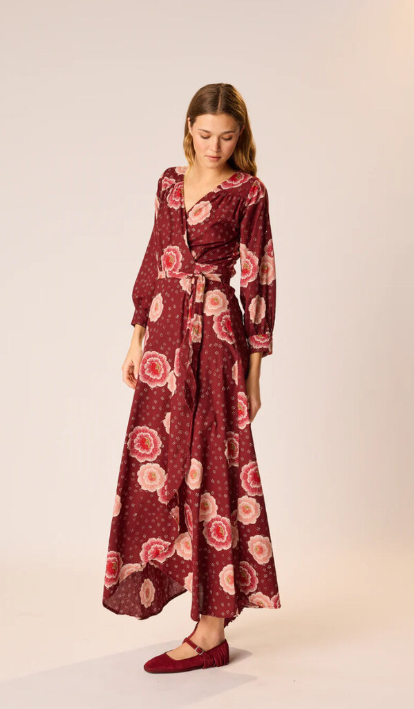 Crossover wrap bodice with wrap closure. Soft gathers at shoulder seams. Voluminous long sleeves with buttons.Maxi dress with asymmetric hemline.