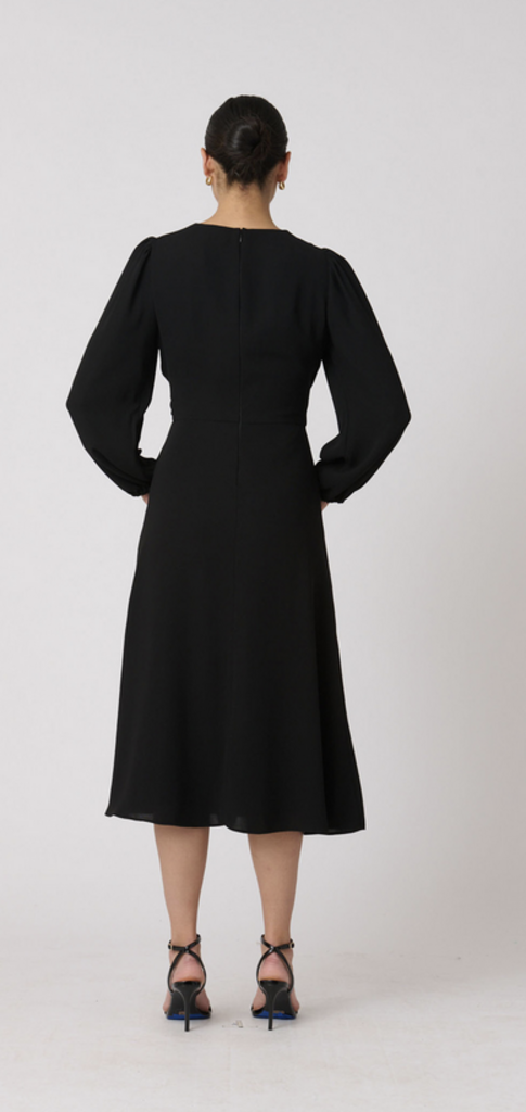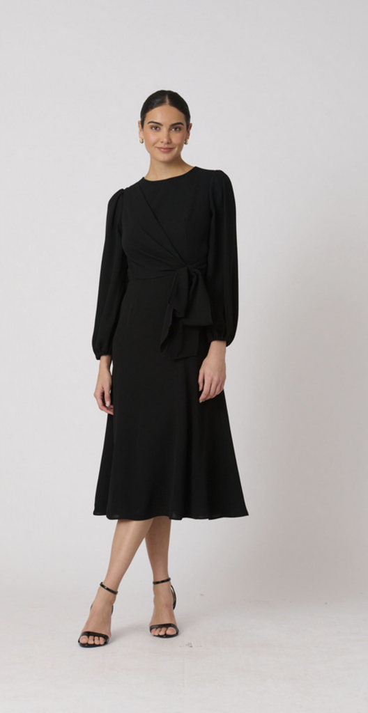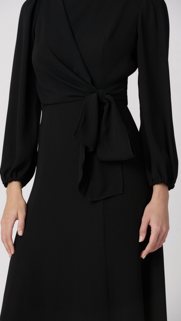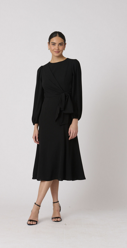 This classic dress in lightweight stretch crepe features a crew neckline, full-length sleeves, and a draped bodice with an asymmetric bow detail at the waist. The skirt is midi length and A-line.
