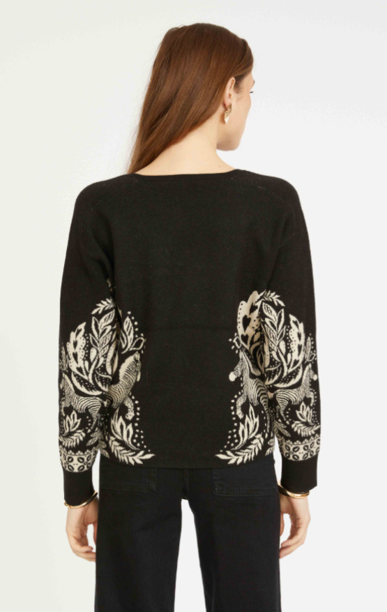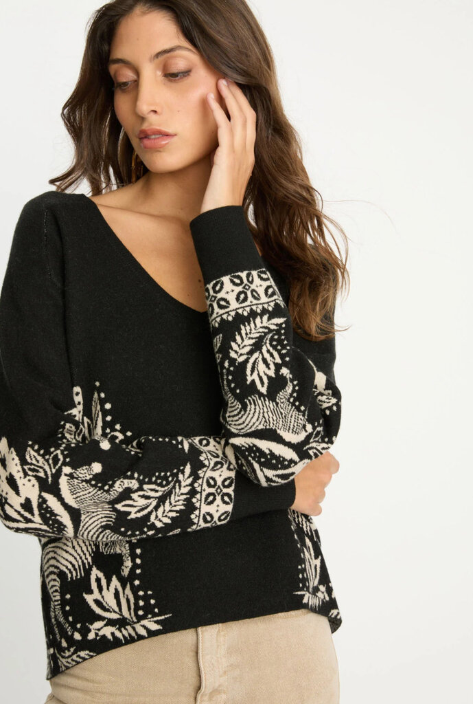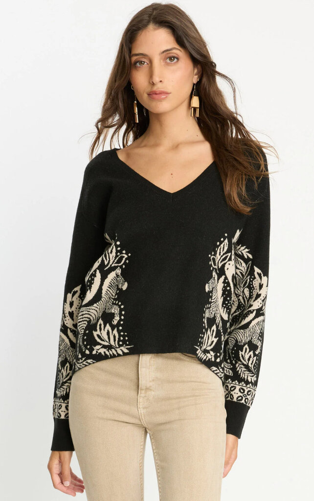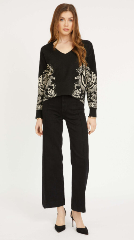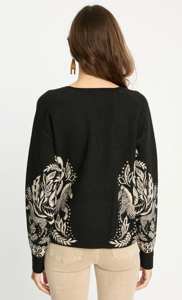 The Krista Sweater brings cozy sophistication with a bold twist. Featuring a relaxed fit and flattering v-neckline, this style is elevated with our striking Zebra Fern motif, where playful zebras peek through stylized leaves and ferns.