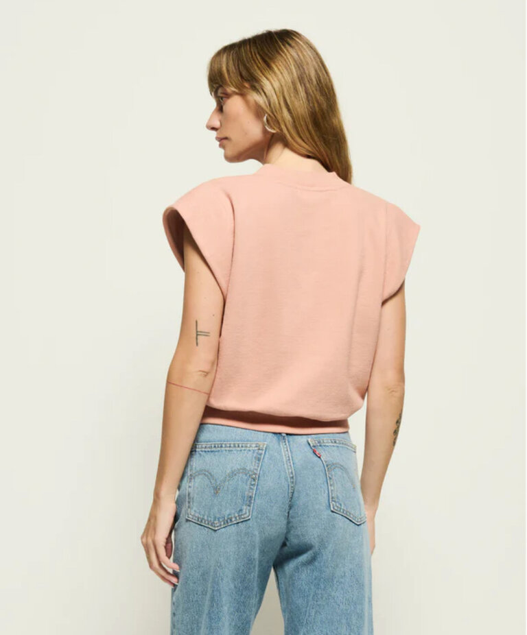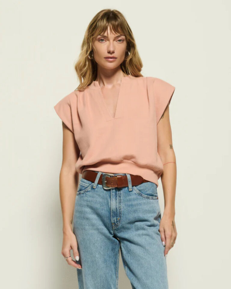 When casual meets chic, you get this sweatshirt top with a daring notch neckline, breezy cap sleeves, and a semi cropped silhouette. Make it a set with the Lincoln pants. This one comes in Sandstorm