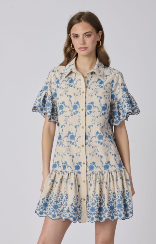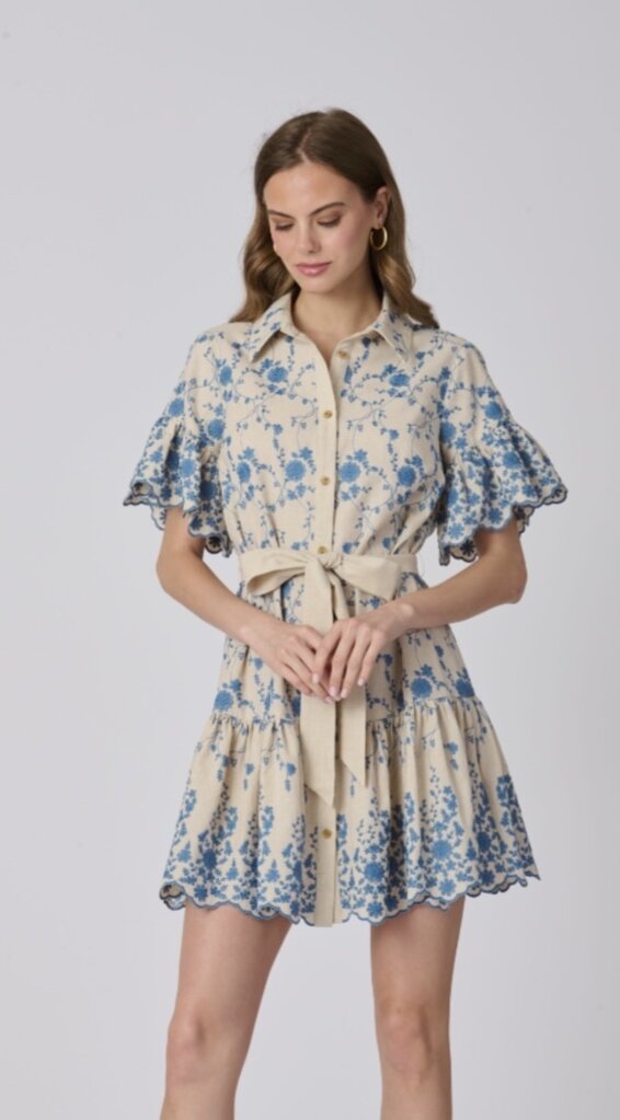 Pattern Lima Dress. This short dress features flutter sleeves, a collared neckline, and a self-tie waist that defines the silhouette. Delicate blue patterning and a flounced hem add an easy, charming finish.