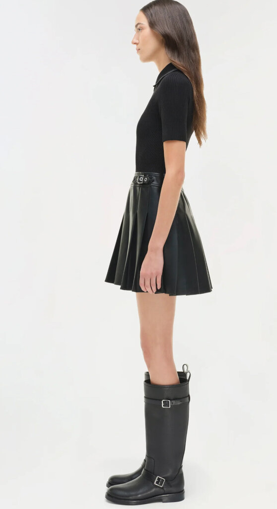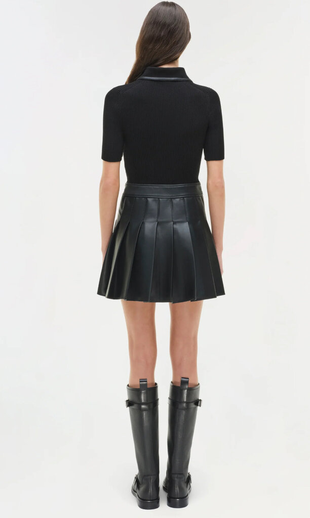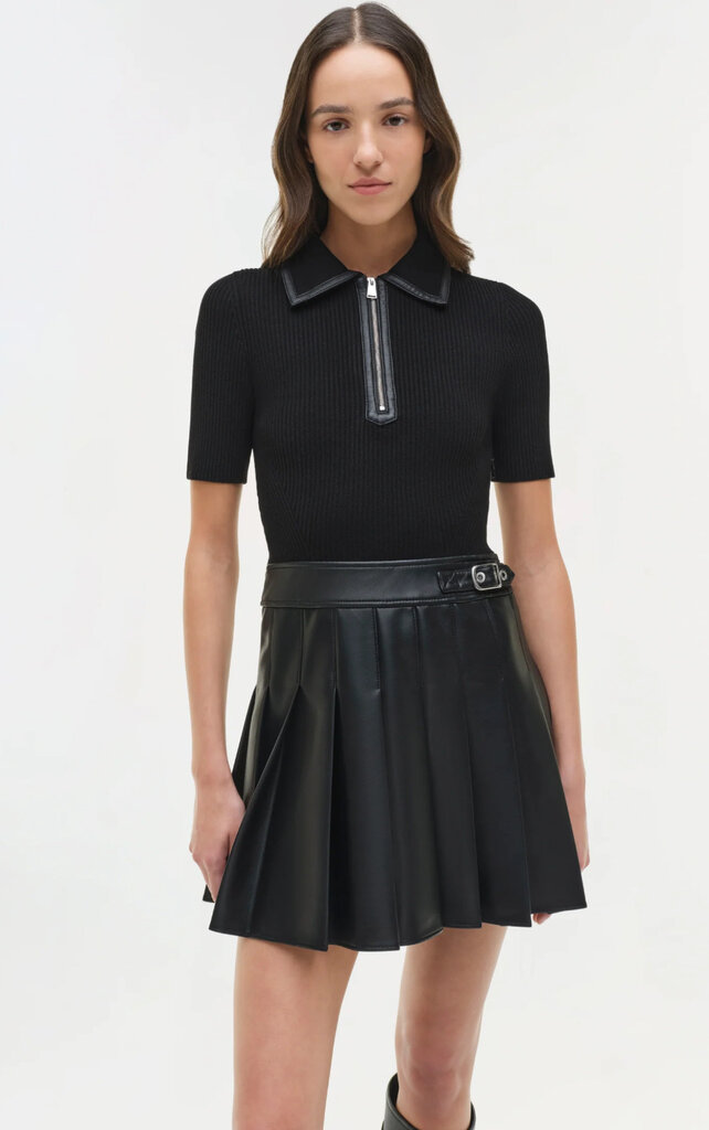 A monochromatic mixed-media mini dress that is defined by its spread collar, partial zip closure, and ribbed knit upper matched with a pleated skirt and side belt detail.