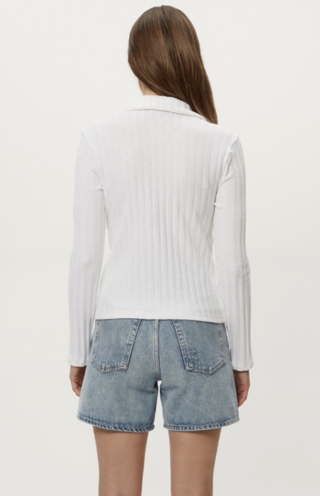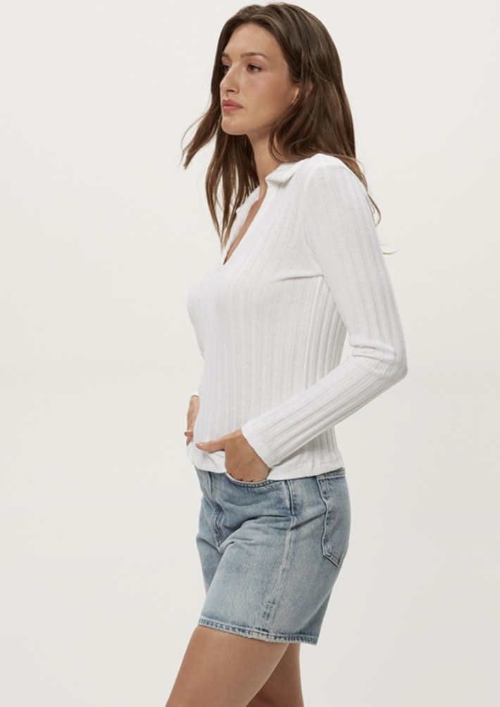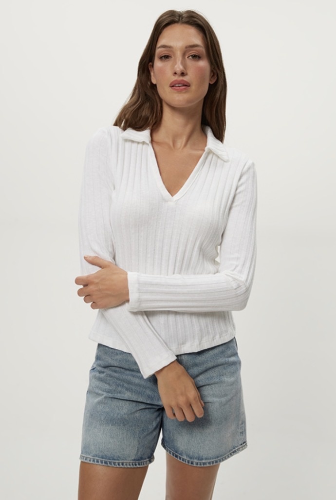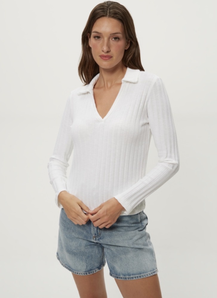 Soft ribbing and subtle shirring create a flattering, body-skimming fit in this long sleeve v-neck top. Finished with a slim collar for a refined, everyday look.