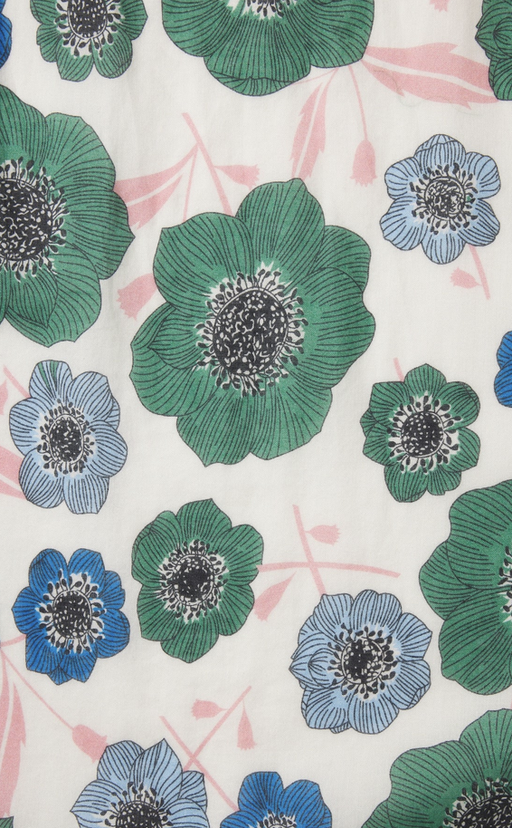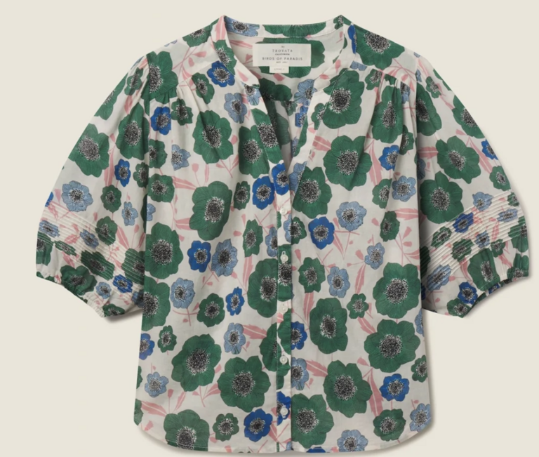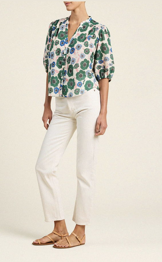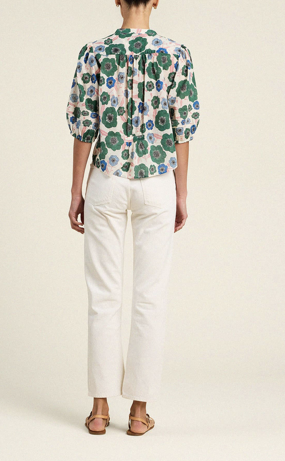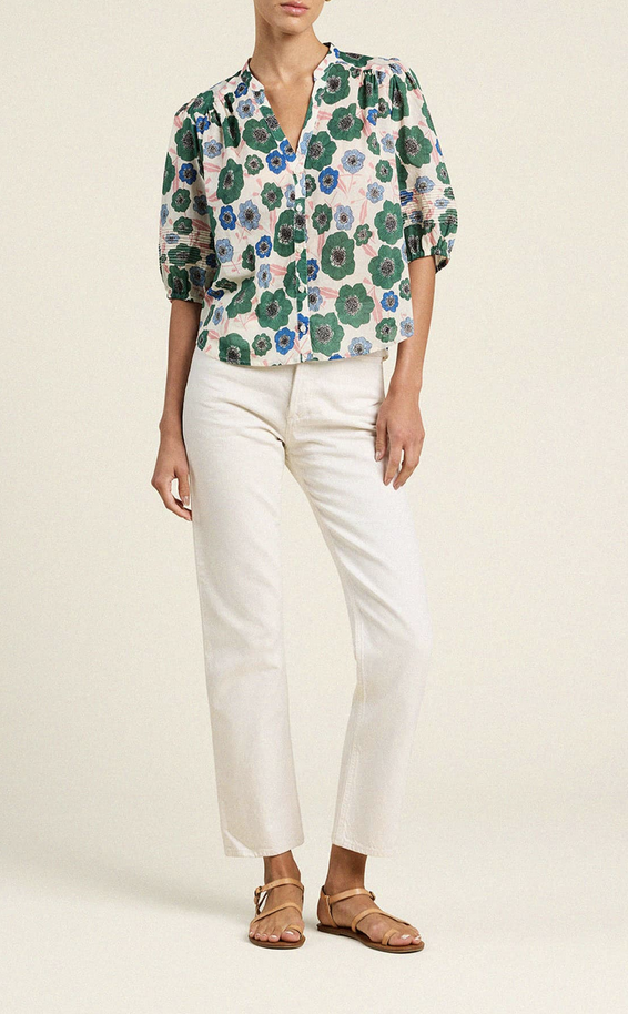 The Loren blouse is a short-puff sleeved blouse with a v-neck opening, buttoned front placket and delicate gathers at the front and back shoulders. Shown here in Green House Bloom and made from our cotton voile.