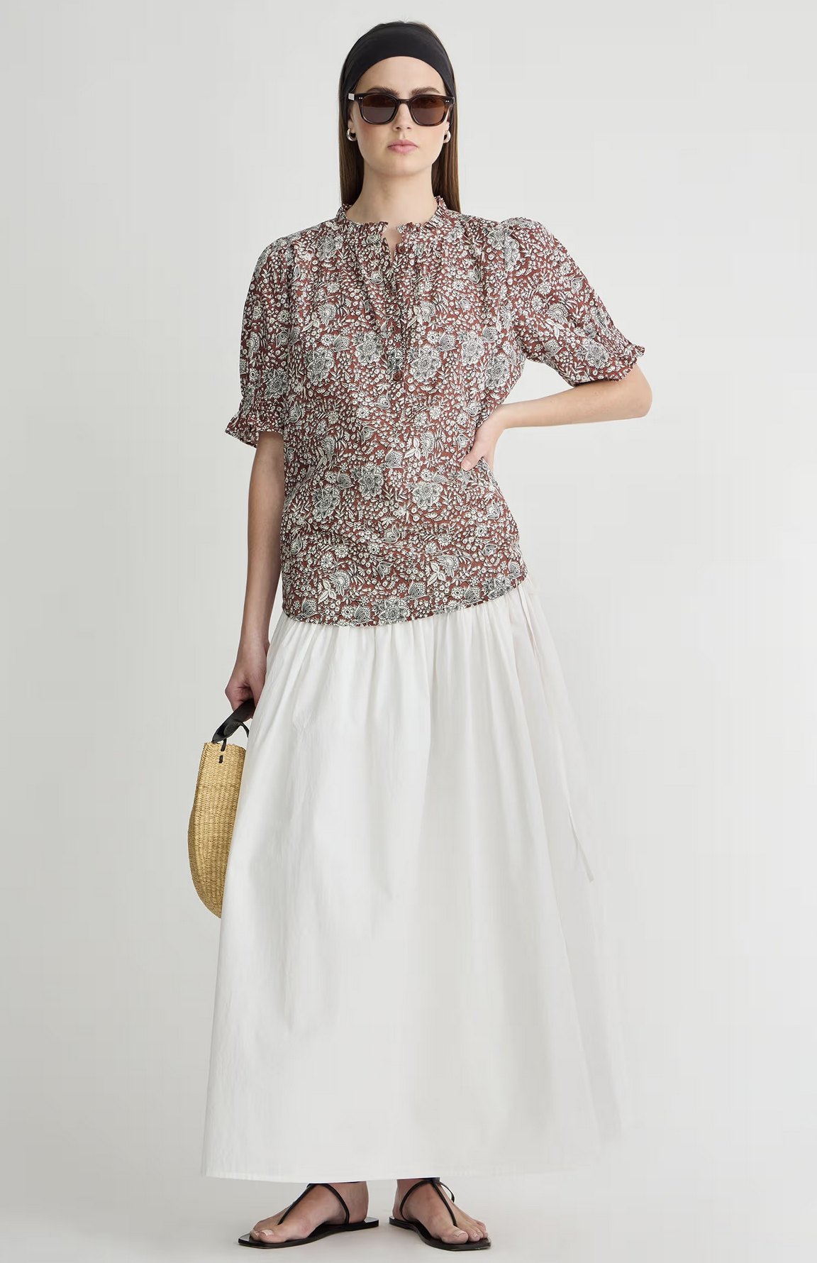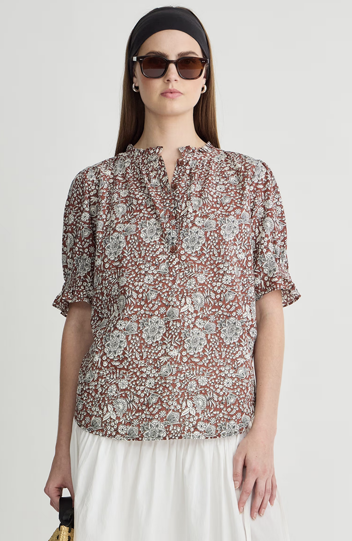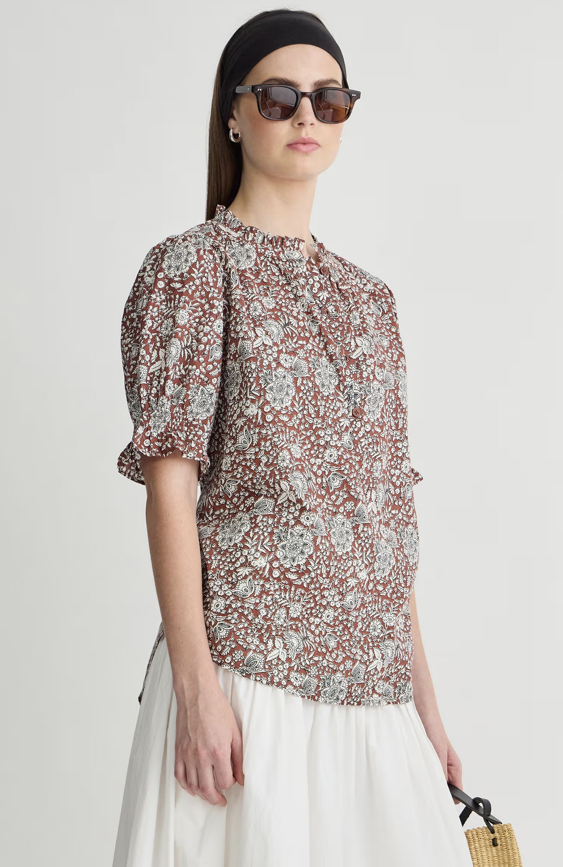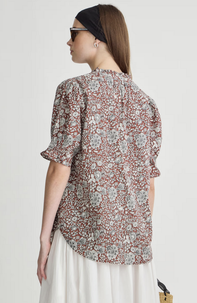 A staple silhouette we're paring with trending trousers and year-round denim. Button closure, ruffled neckline, straight silhouette, high-low hem, short puff sleeves.