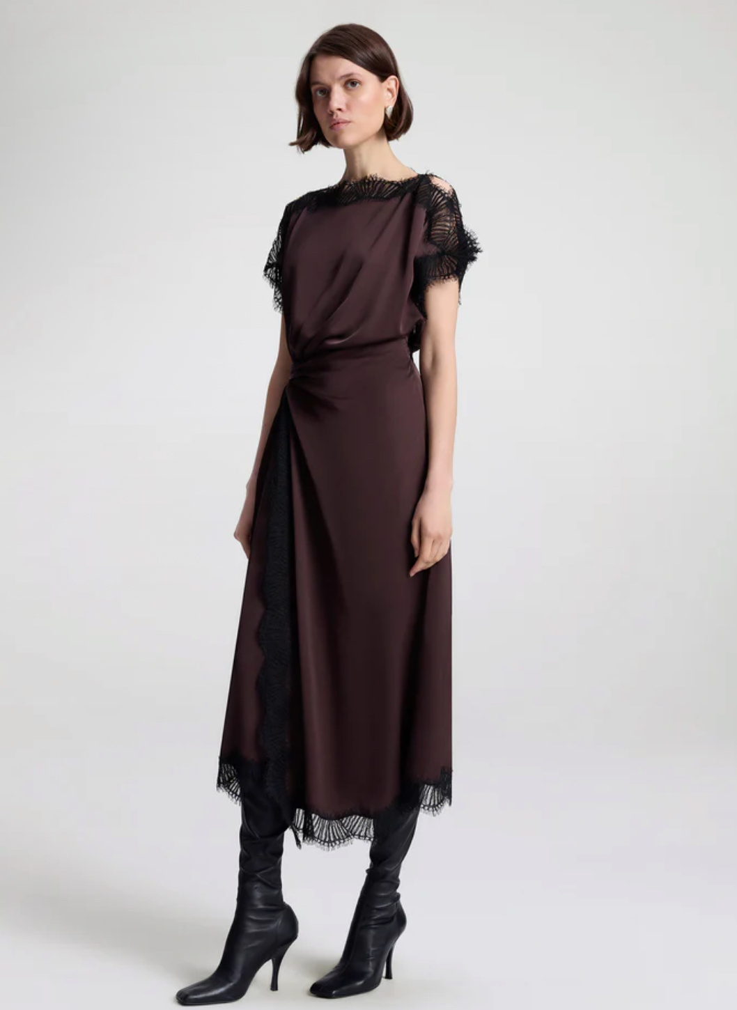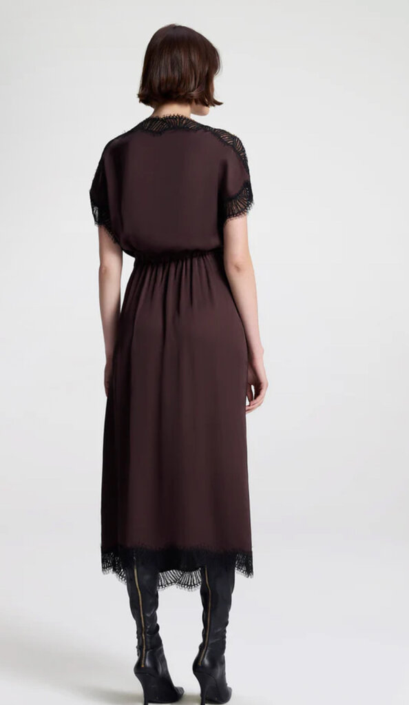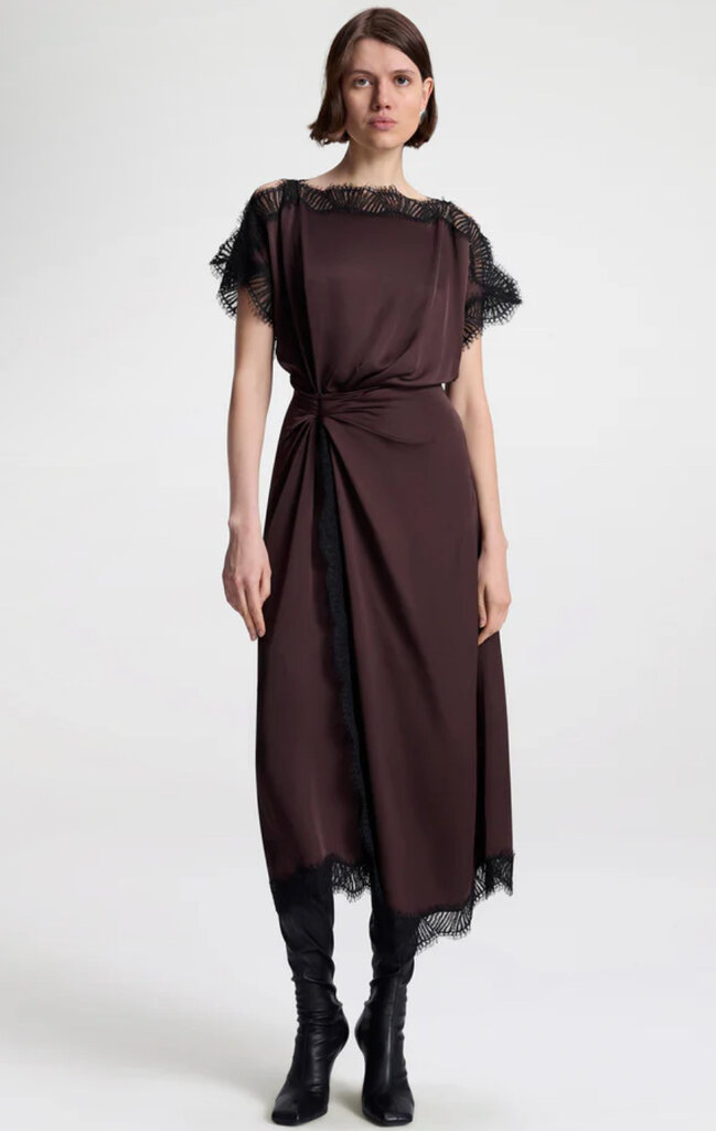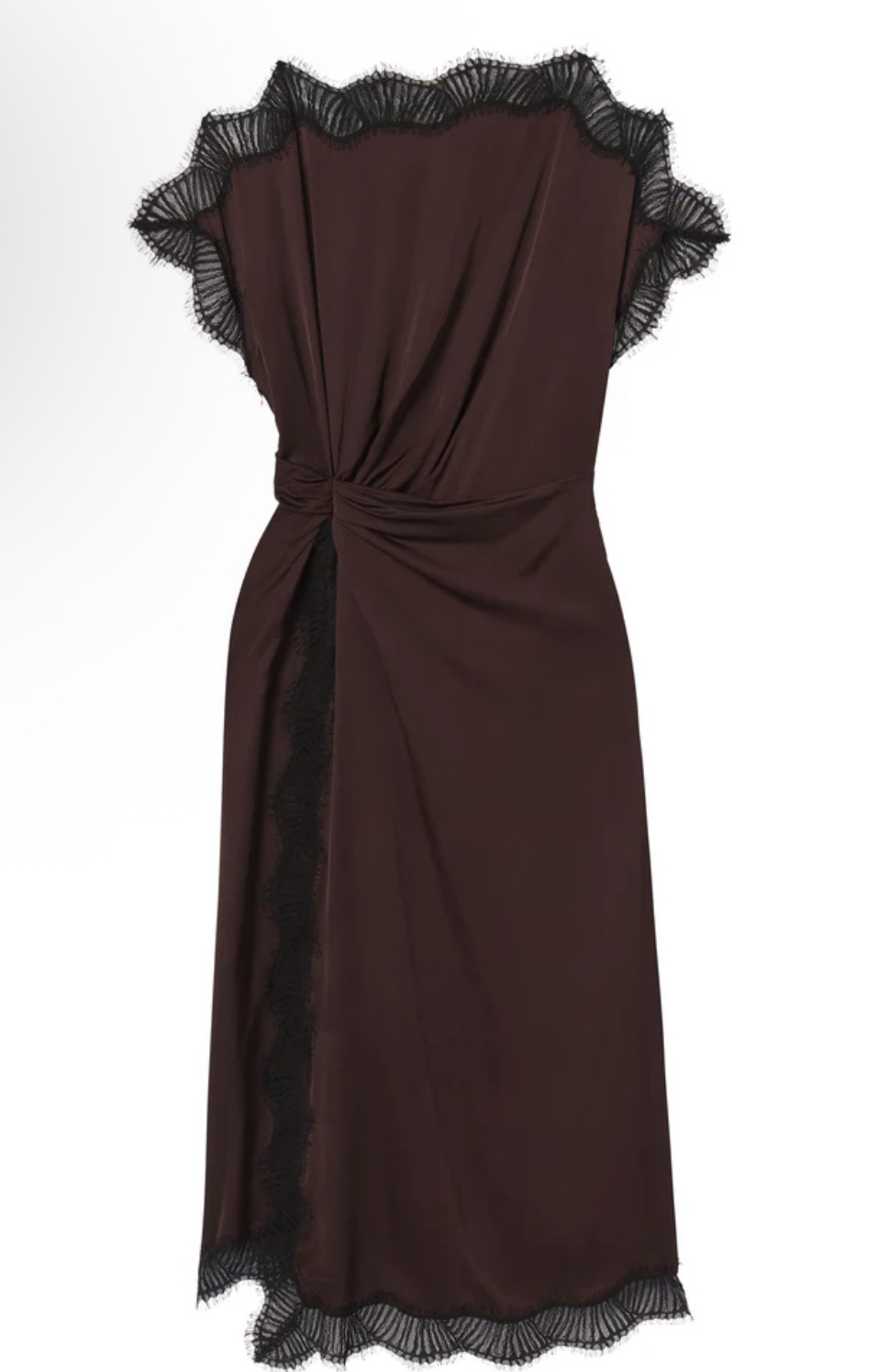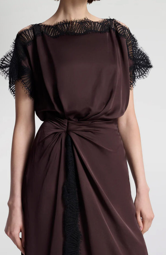 Scalloped eyelash lace trims this fluid viscose midi with a bateau neckline, flutter sleeves, and a ruched waist.