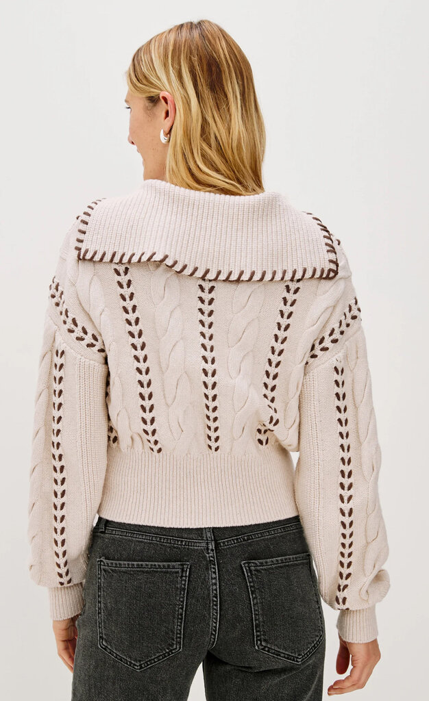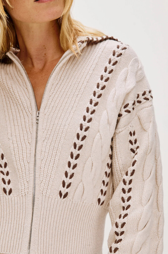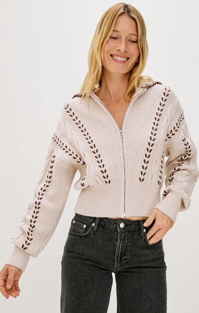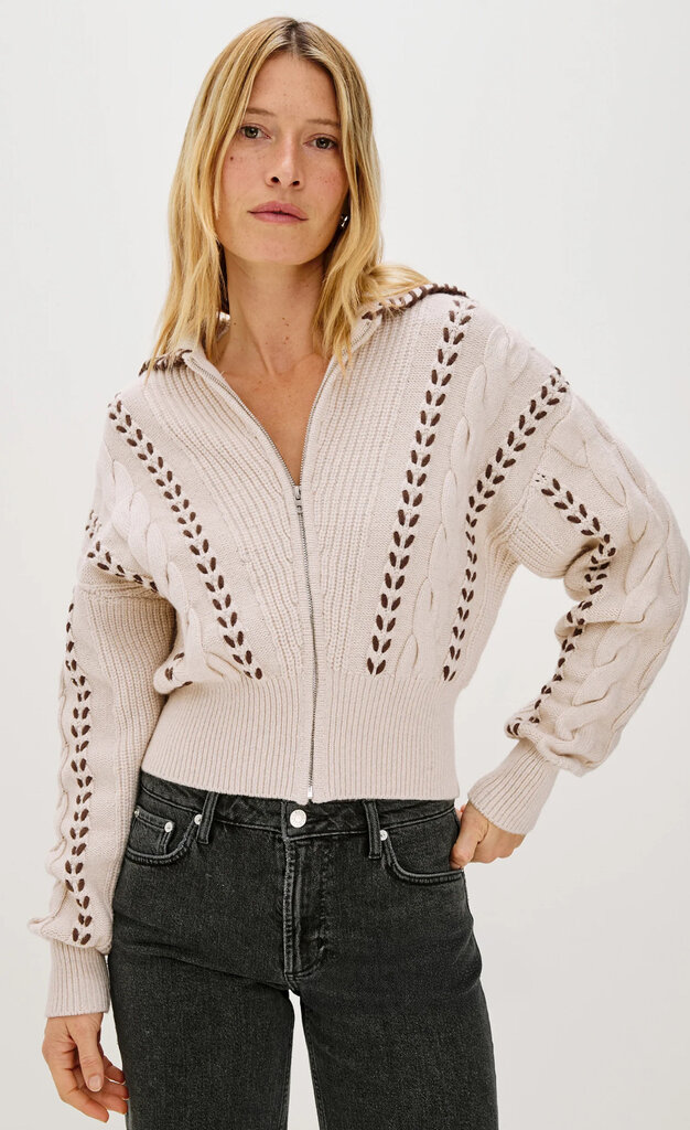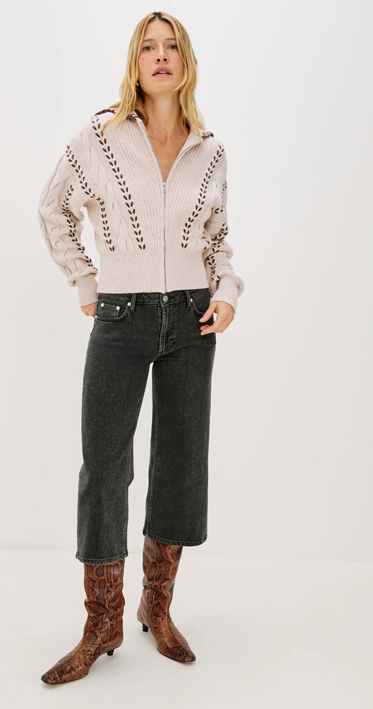 The Lune is a fitted, zip-up cardigan in a soft cotton blend. Thoughtful touches include a relaxed collar, ribbed cuffs and hem, and whipstitch cable details.