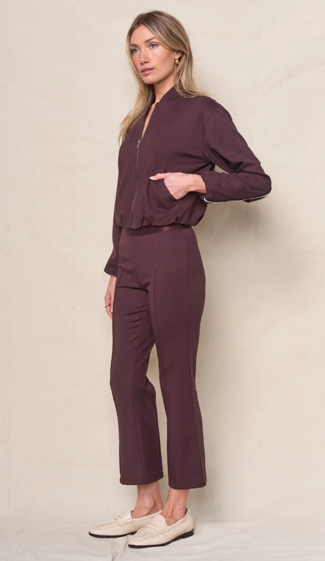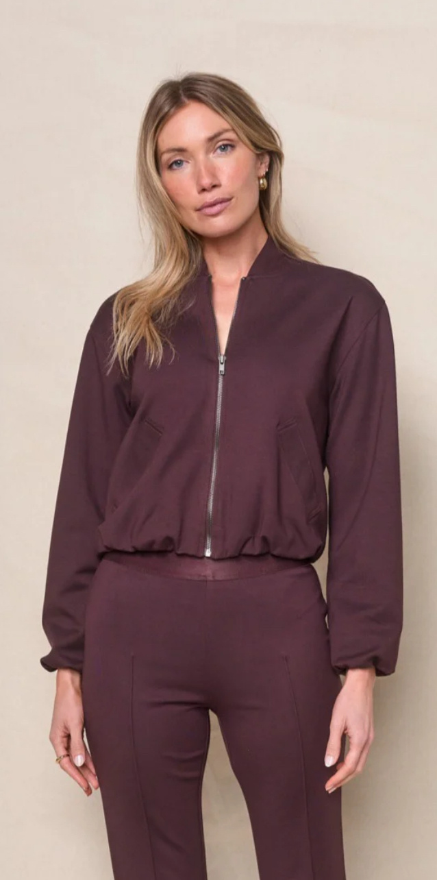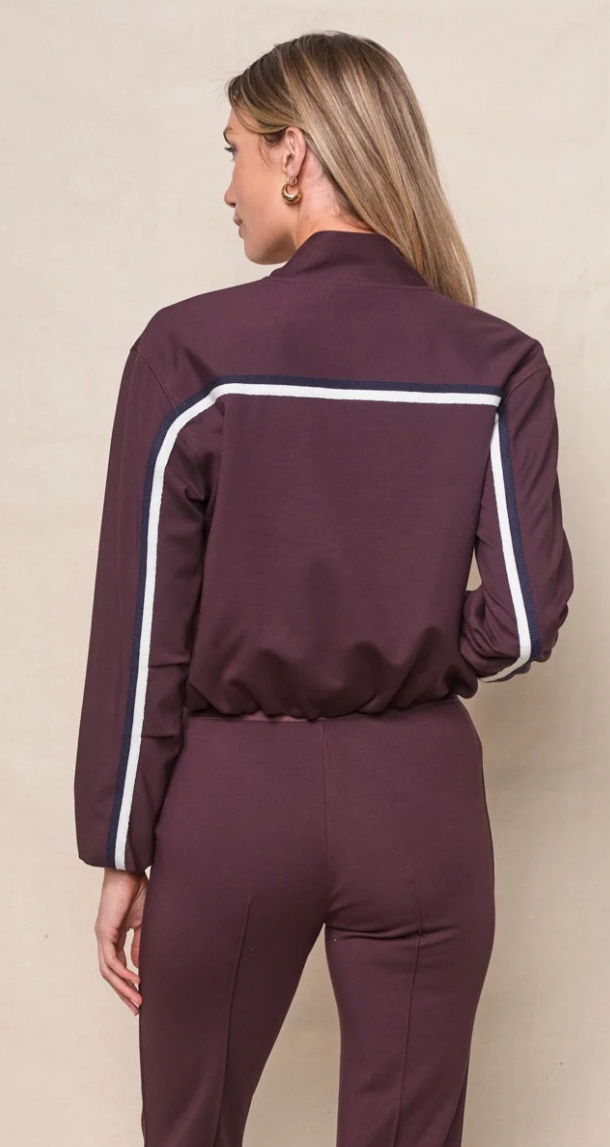 Luxe Bomber jacket with a fitted waistband and elastic cuffs, featuring angled front pockets and distinctive blue and white stripes running down the length of both sleeves. The jacket's style is sporty yet casual, with a subtle collar and a slightly cropped fit for a modern silhouette.