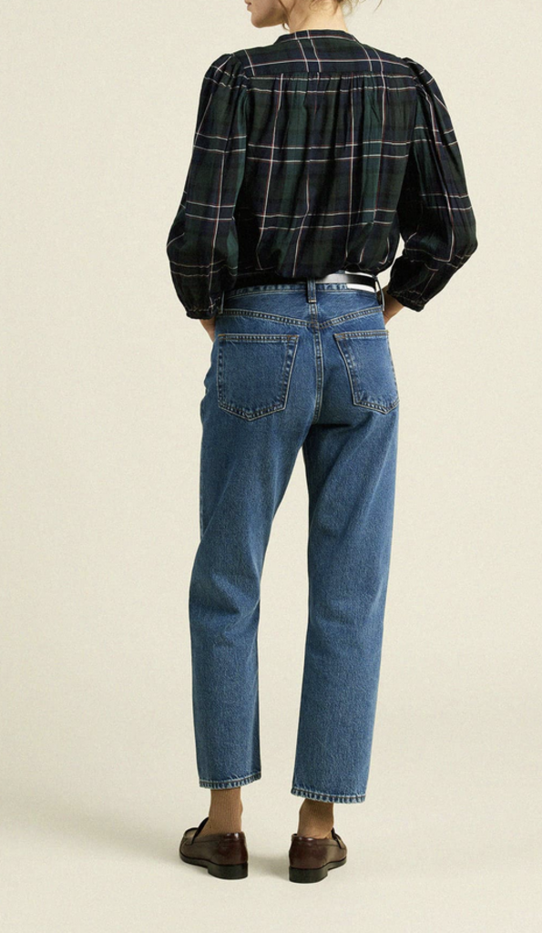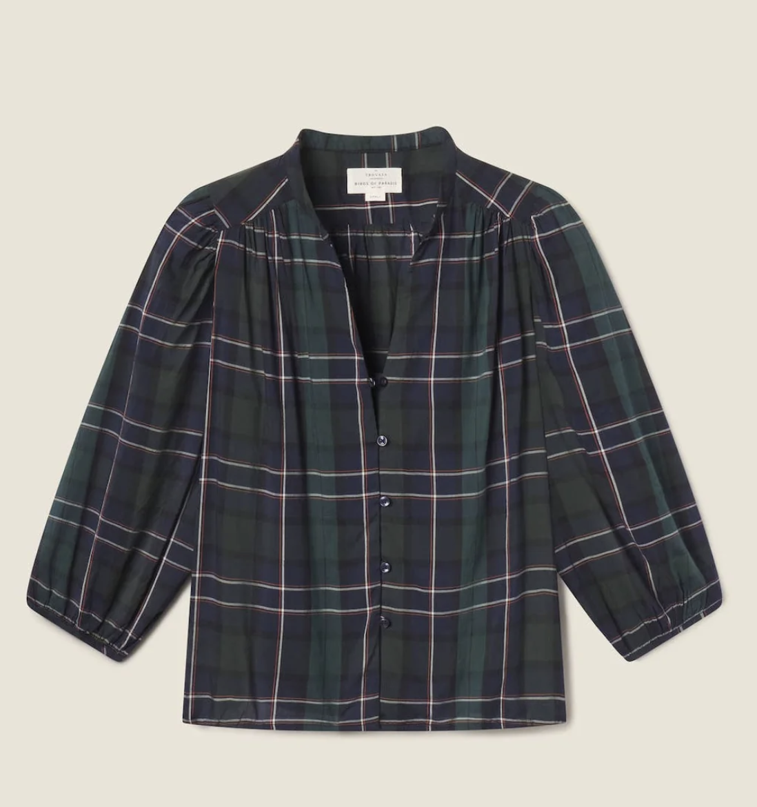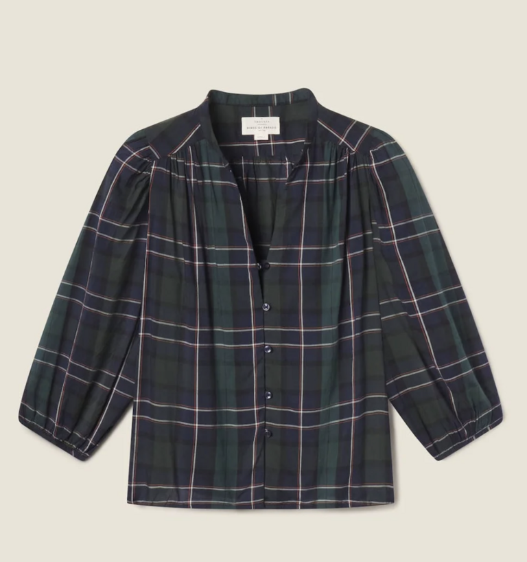 The Maisey Blouse is a button-front blouse with billowy shoulder gathers and a clean standing collar. Gathered three-quarter length sleeves are finished with delicate bindings. Includes our signature back detail with a gathered waist tab.