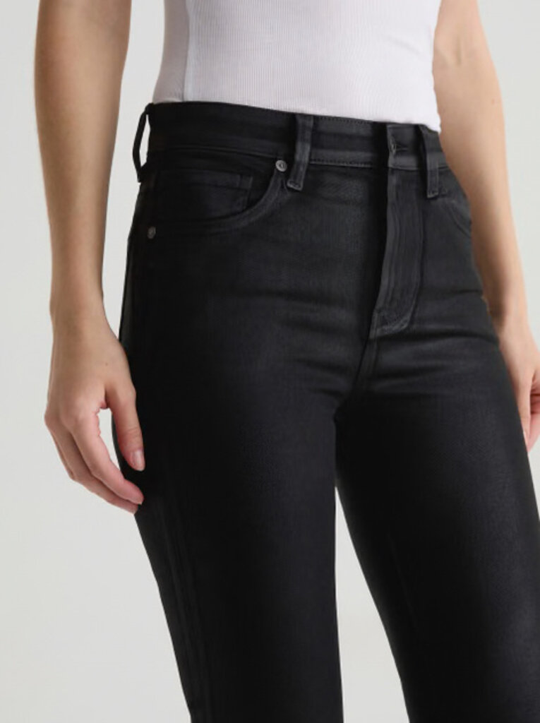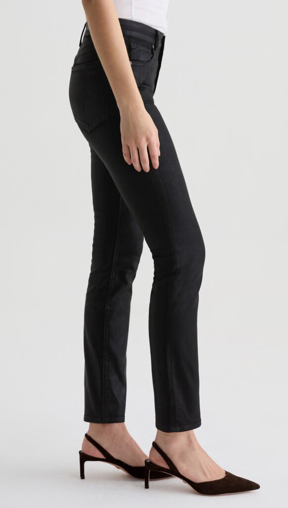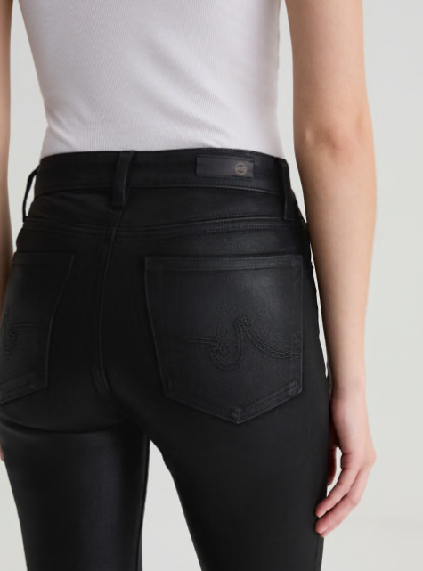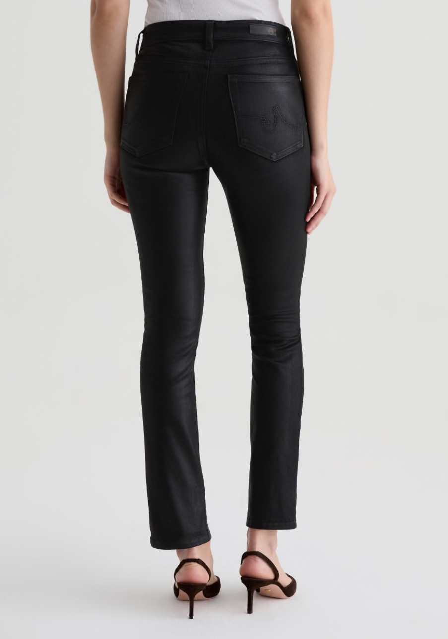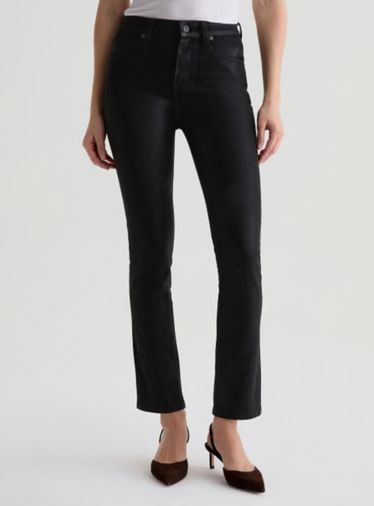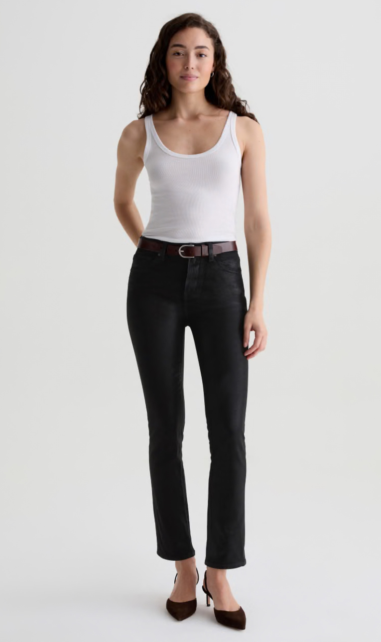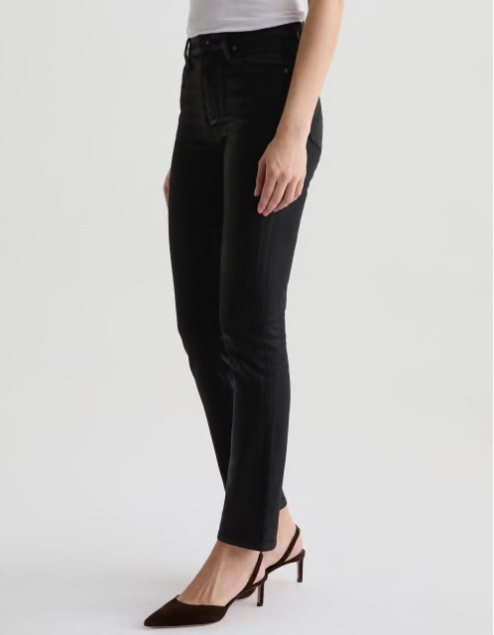 The Mari mid-rise straight leg jean for women features a leatherette-coated black hue. Mari offers a flattering mid-rise waist and fits easy around the hips, finished with a straight leg and subtle slim leg opening. This women’s straight jean is designed in 8.7 oz. Hyper Soft Bull Denim, an exclusive AG Cloud Soft Denim™ fabric. This special left-hand twill allows the yarns to gently relax and untwist for a luxe, supple feel. It's designed to get even softer the more you wear it. There's dual-elastic stretch built in for extra comfort and powerful recovery.