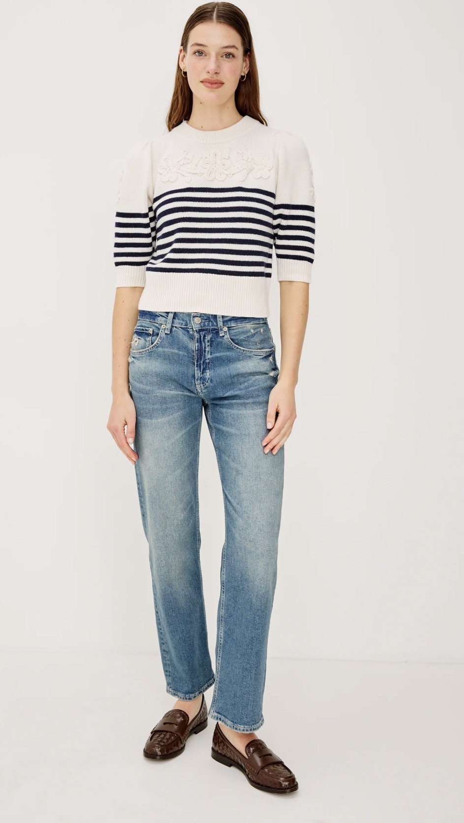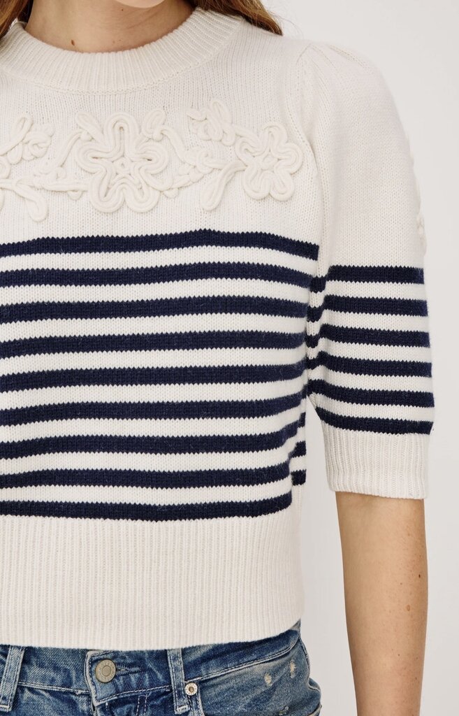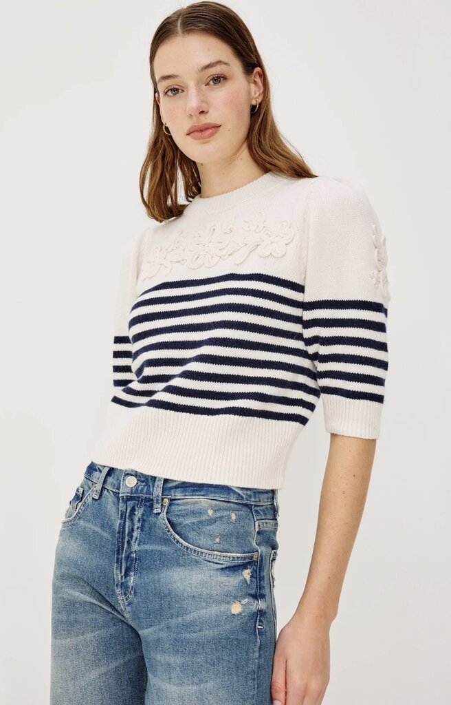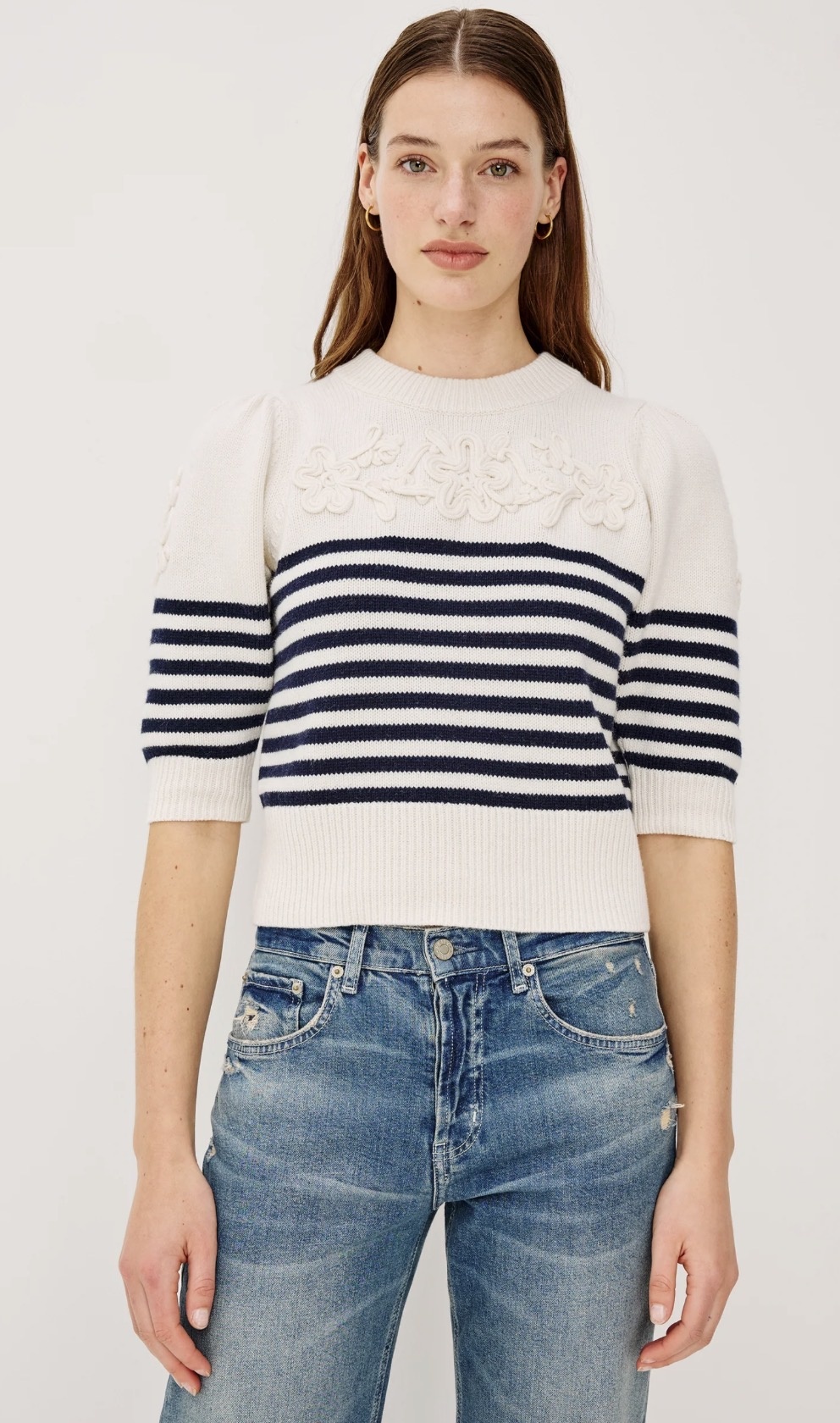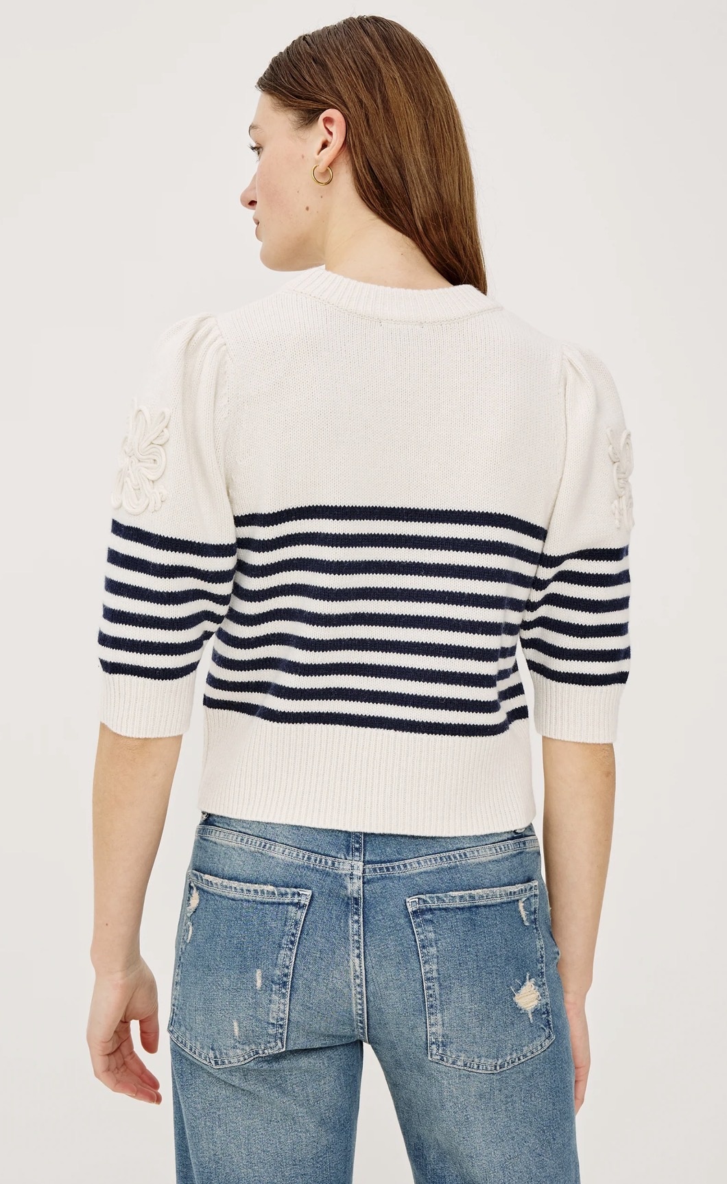 Soft wool-blend knit in ivory and navy with puff sleeves and delicate floral embroidery at the chest, perfect for spring layering.