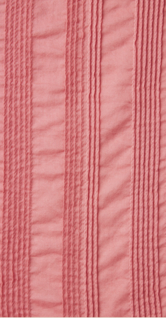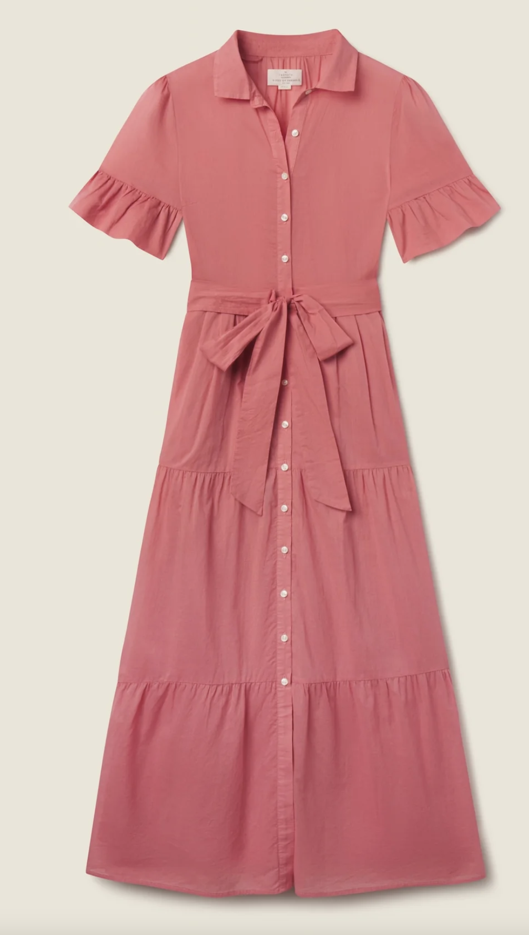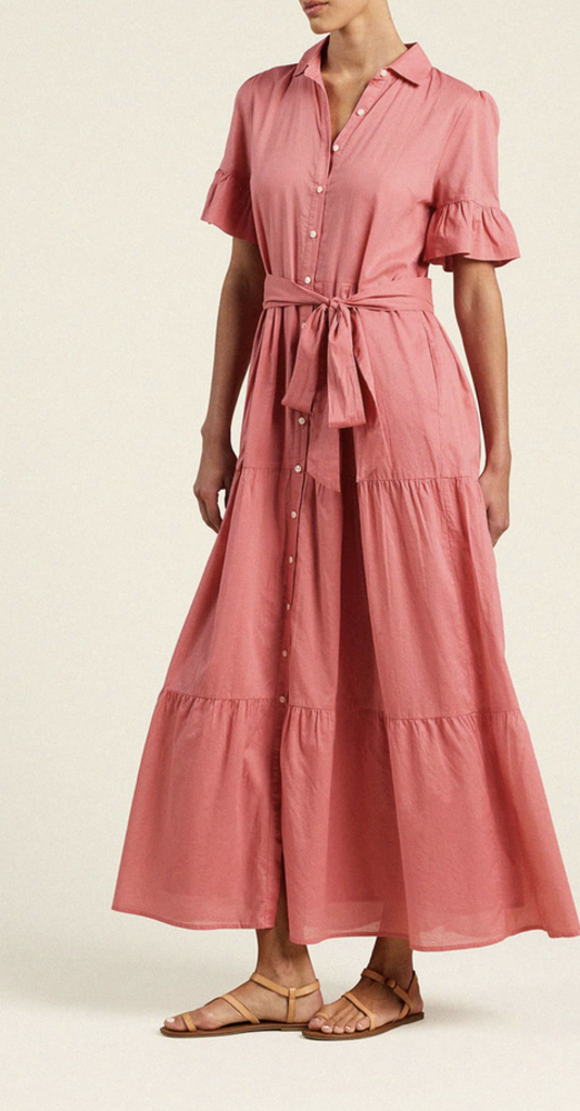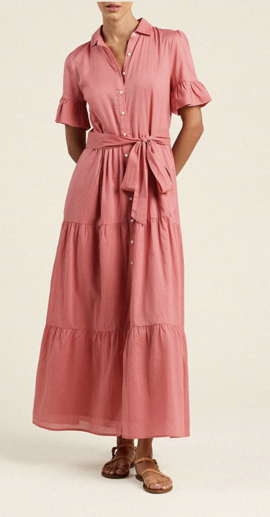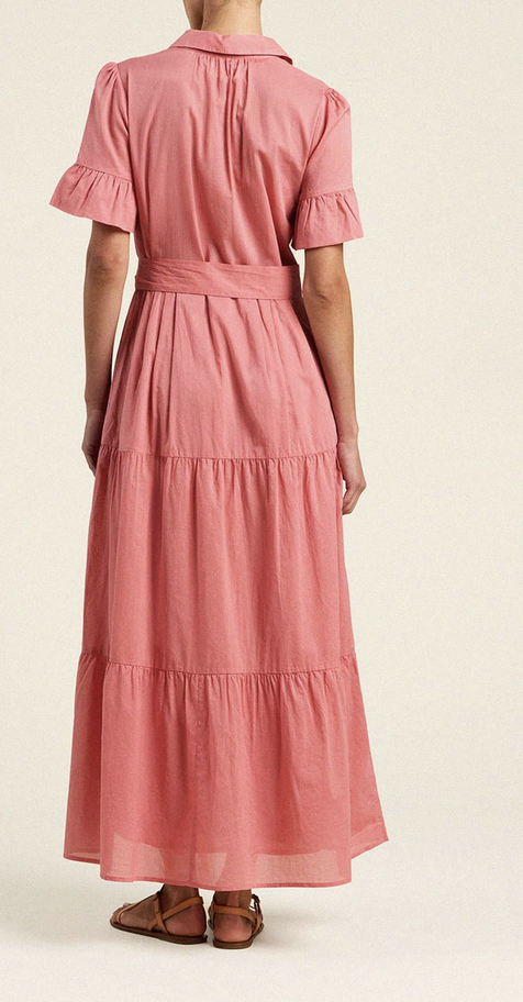 The Martine dress is long and flowing, reaching the ground. Long pleats from the waist give extra movement to the tiered skirt. Completed with antique white buttons and matching self-fabric sash.