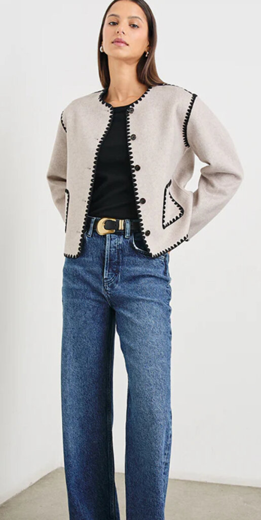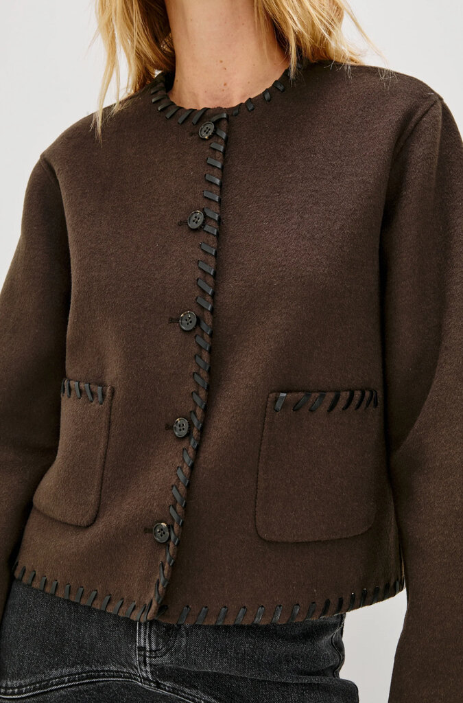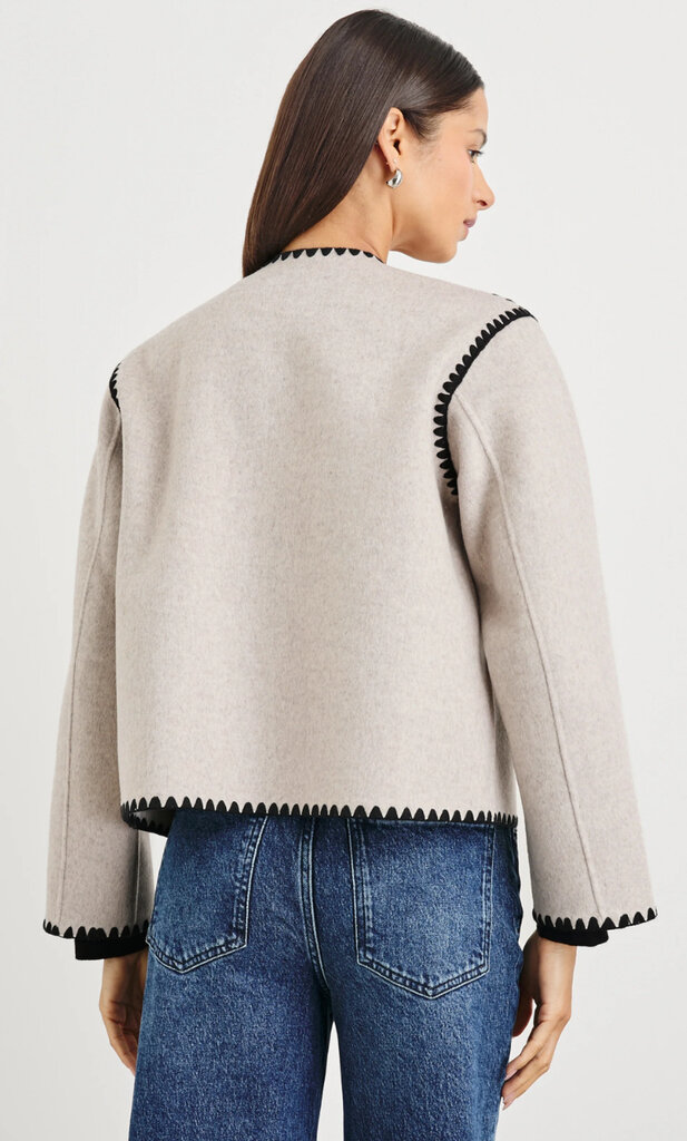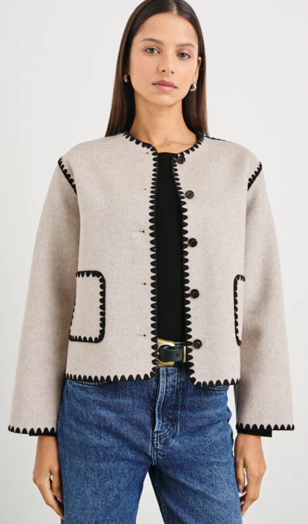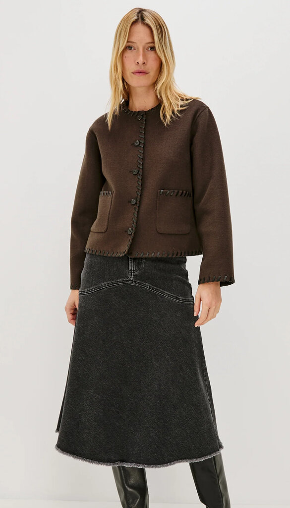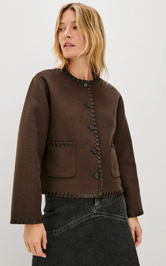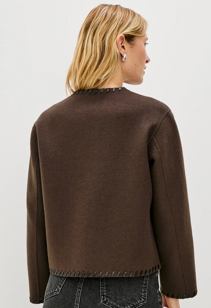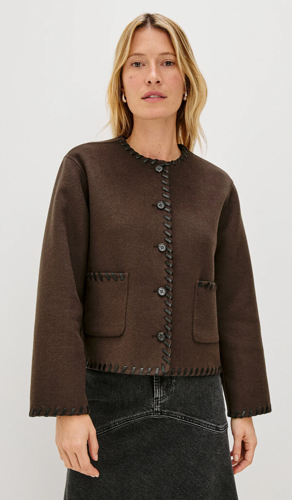 The Melanie is a heavy wool jacket that's both stylish and cozy. Its unique, put-together look is enhanced by contrast stitching at the seams, buttons, and a boxy fit.