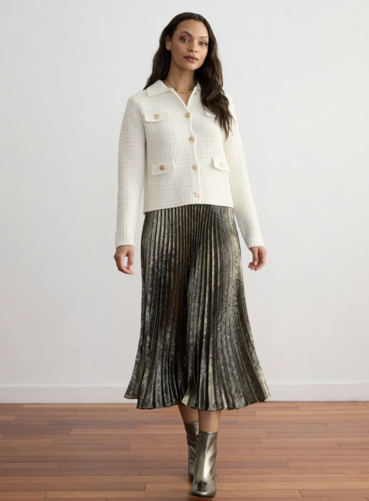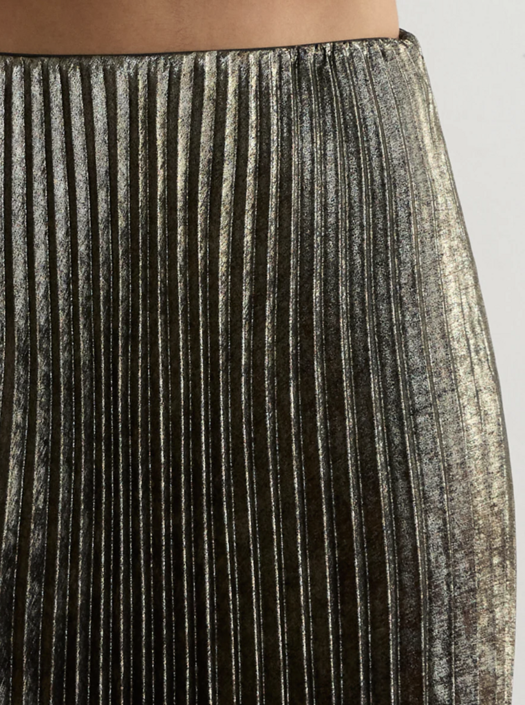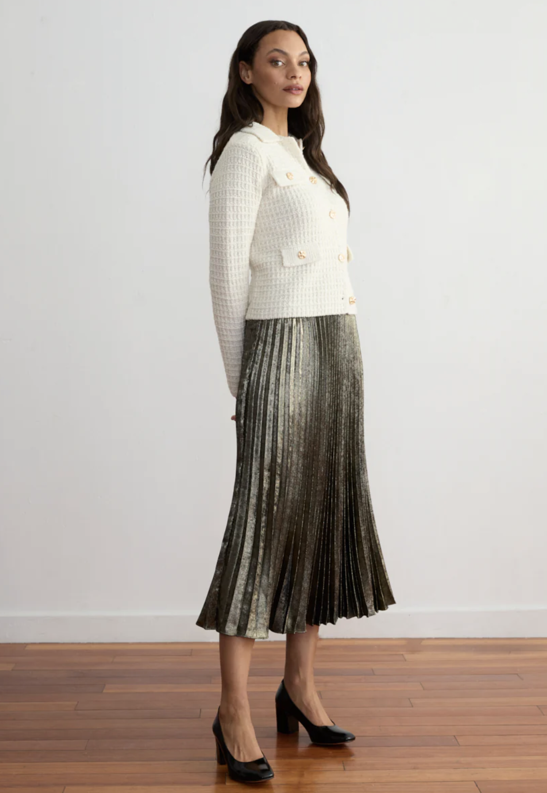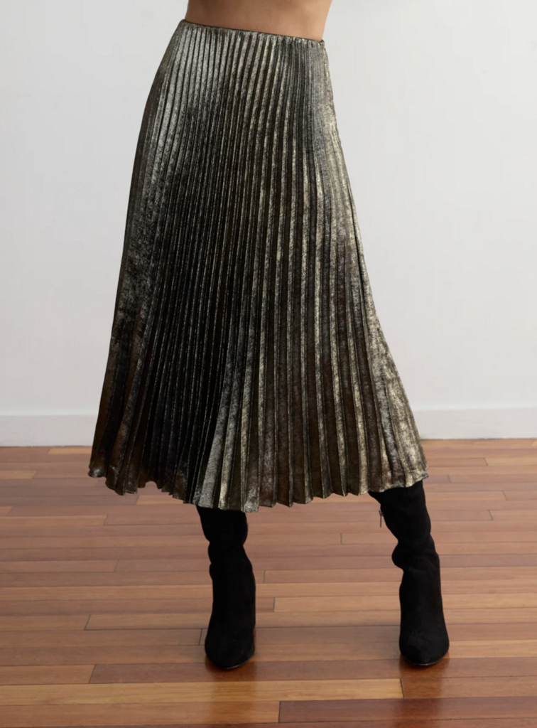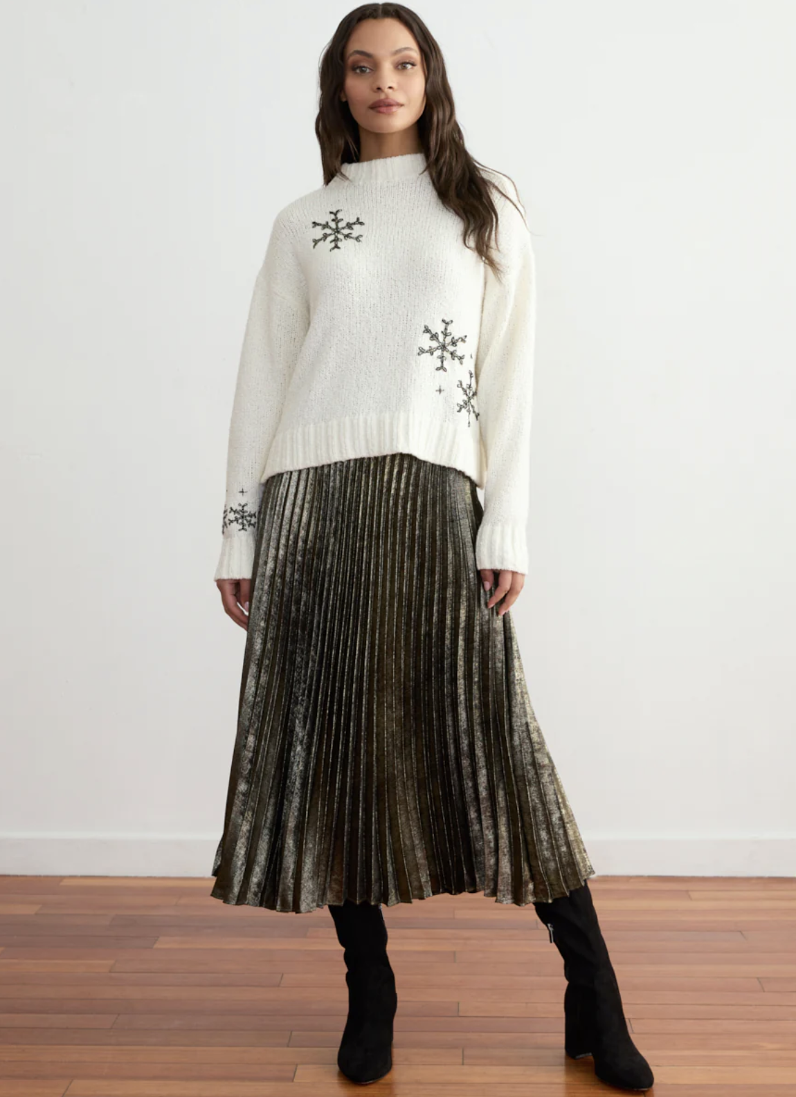 Meet your new holiday hero: our Metallic pleated Skirt that shines as much as your festive spirit. With a sleek black base and shimmering metallic overlay, it was designed to pair effortlessly with all our holiday sweaters—but honestly, it goes with everything. Tea-length and elegantly flirty, the pleats add movement and texture, bringing glitz that transforms any outfit into a statement!