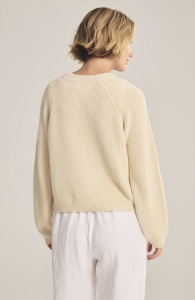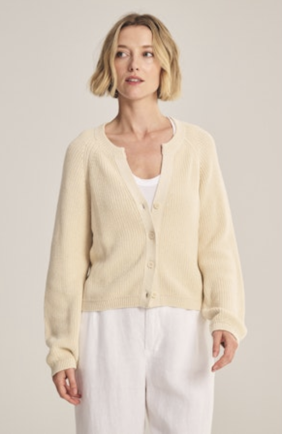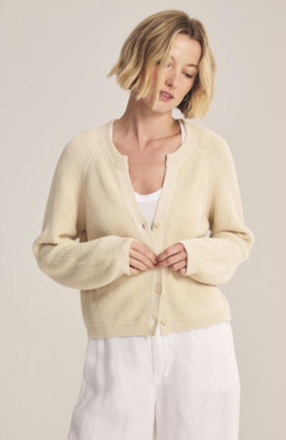 A lightweight cotton cocoon sweater with a button-front V-neck and an easy , hip length fit-perfect for effortless spring layering.