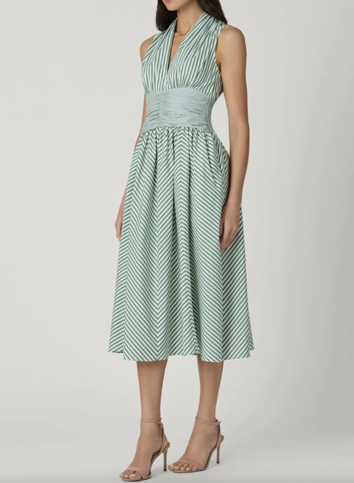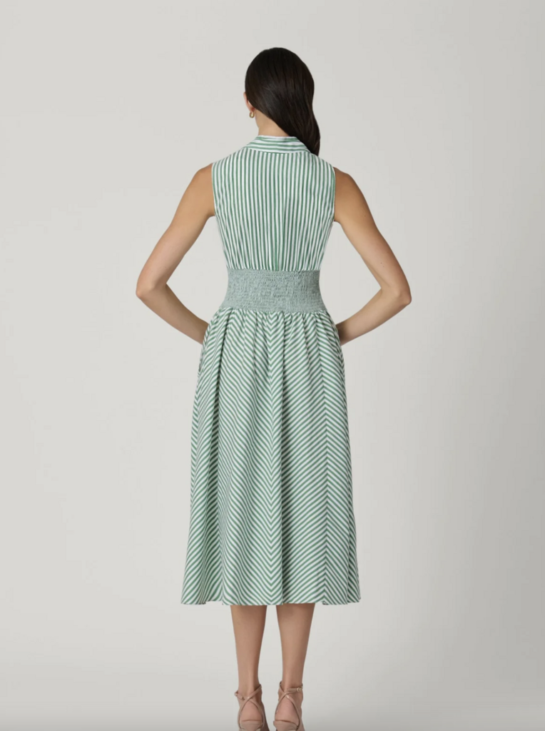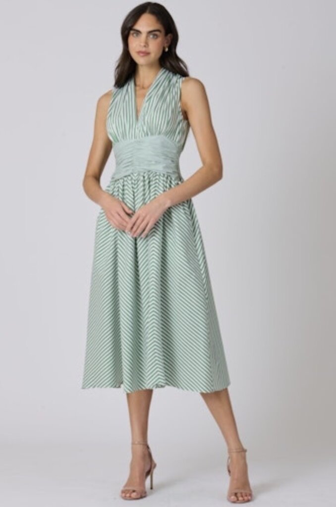 The Miriam midi dress features a sleeveless v-neck bodice and a softly cinched waist for a flattering fit. Finished with a flowing skirt for effortless, feminine movement.