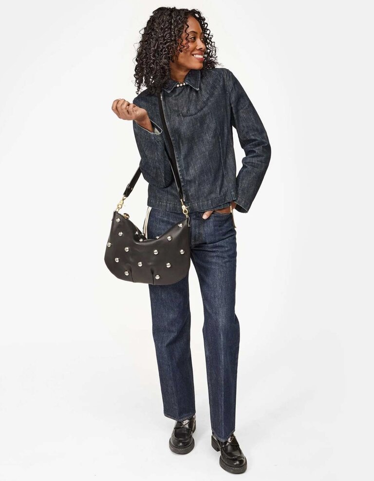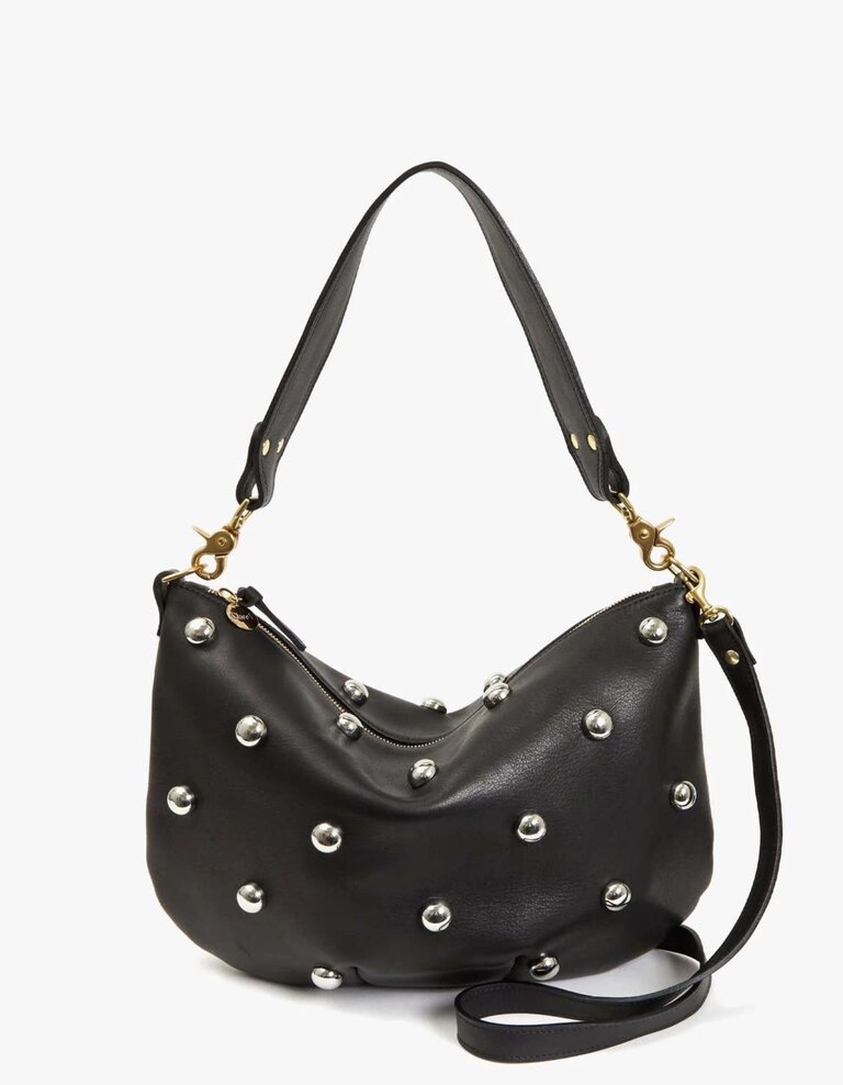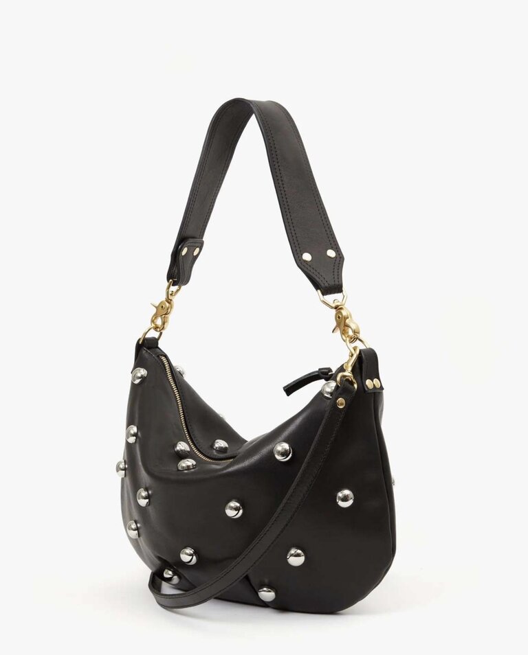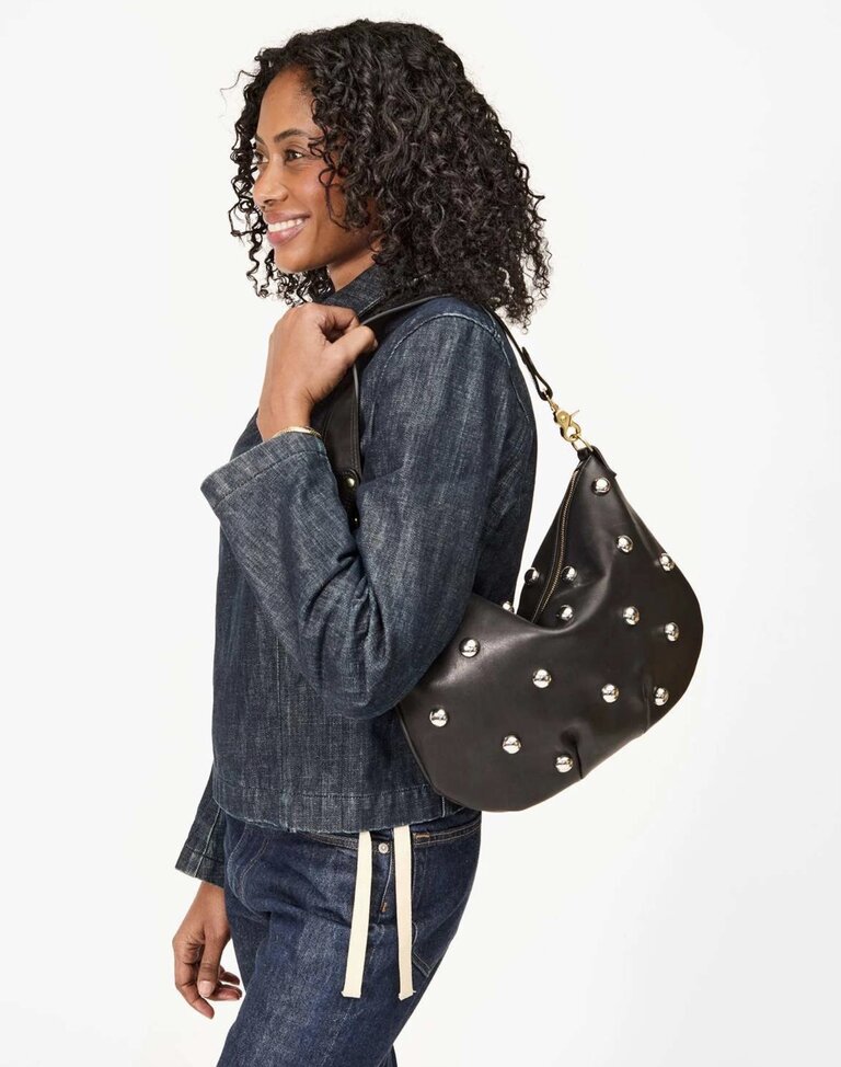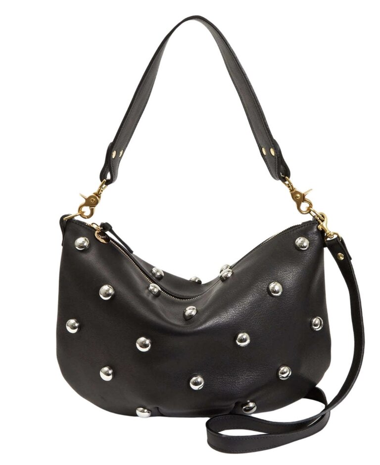 The one and only zip-top crescent bag with generous capacity for holding your iPad, water bottle, and sunnies. Features one interior pocket for added organization and two ways to carry: a slightly shorter 36.5-inch crossbody strap and a wide, comfy 21-inch shoulder strap. Made of leather with studs.