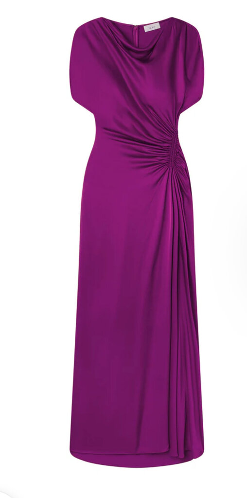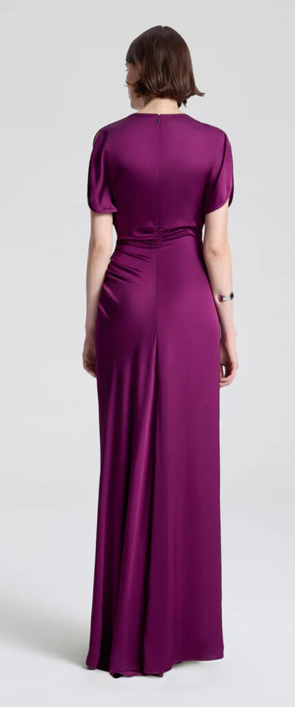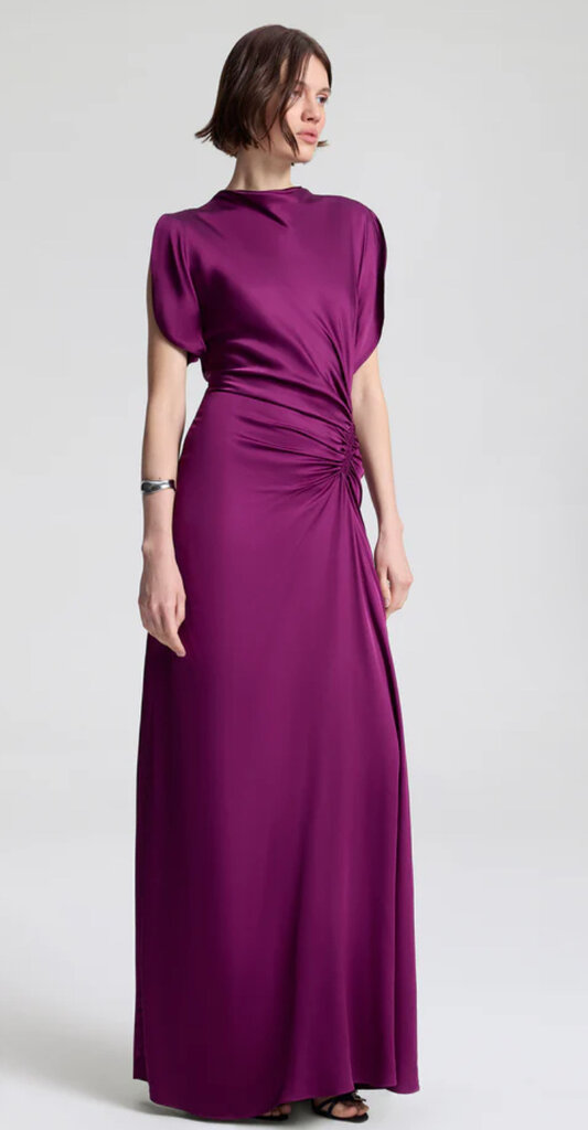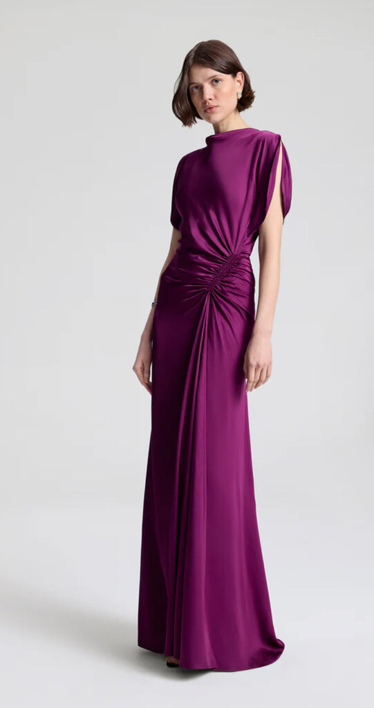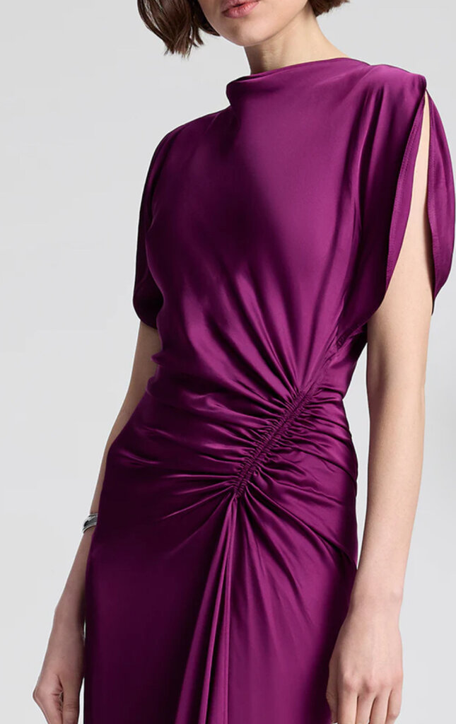A fluid satin silhouette featuring a draped cowl neckline, slit sleeves, and soft gathering at the hip for a fluid silhouette.