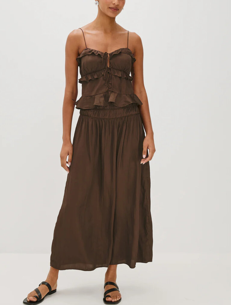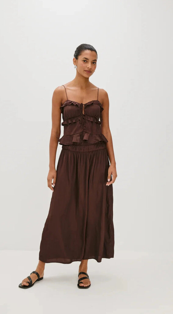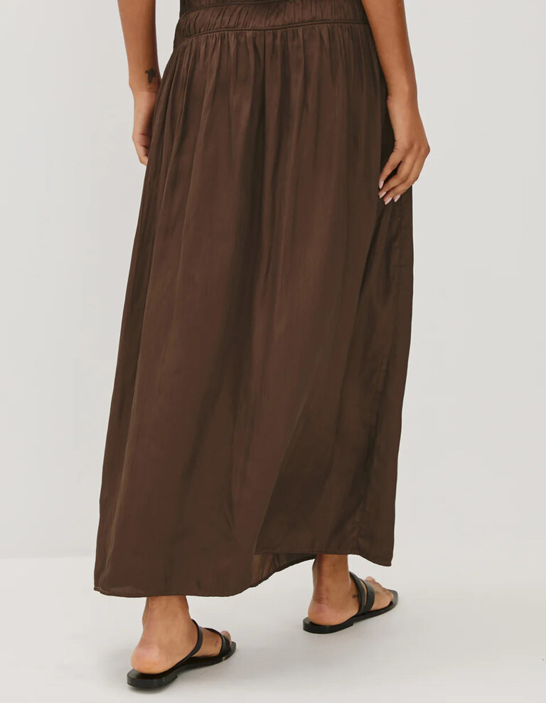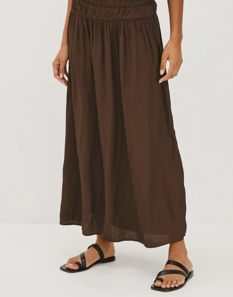 The Nara midi skirt is featured in elegant crinkle satin. A fitted waistband gives way to a flowy fit throughout, complete with a discreet side zipper for effortless wear.