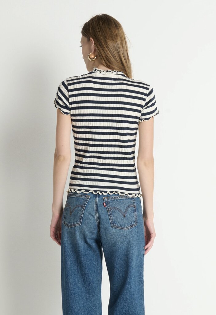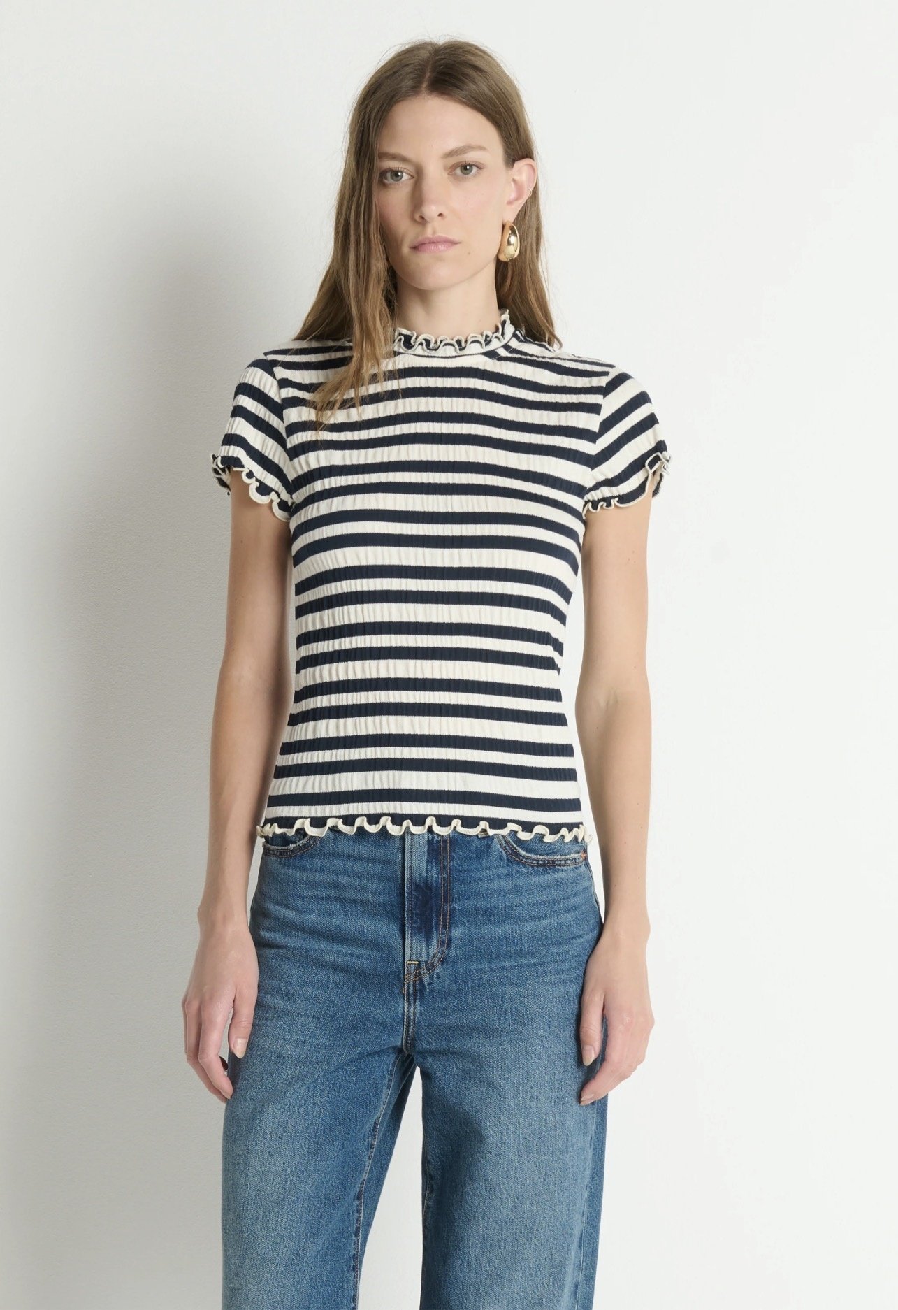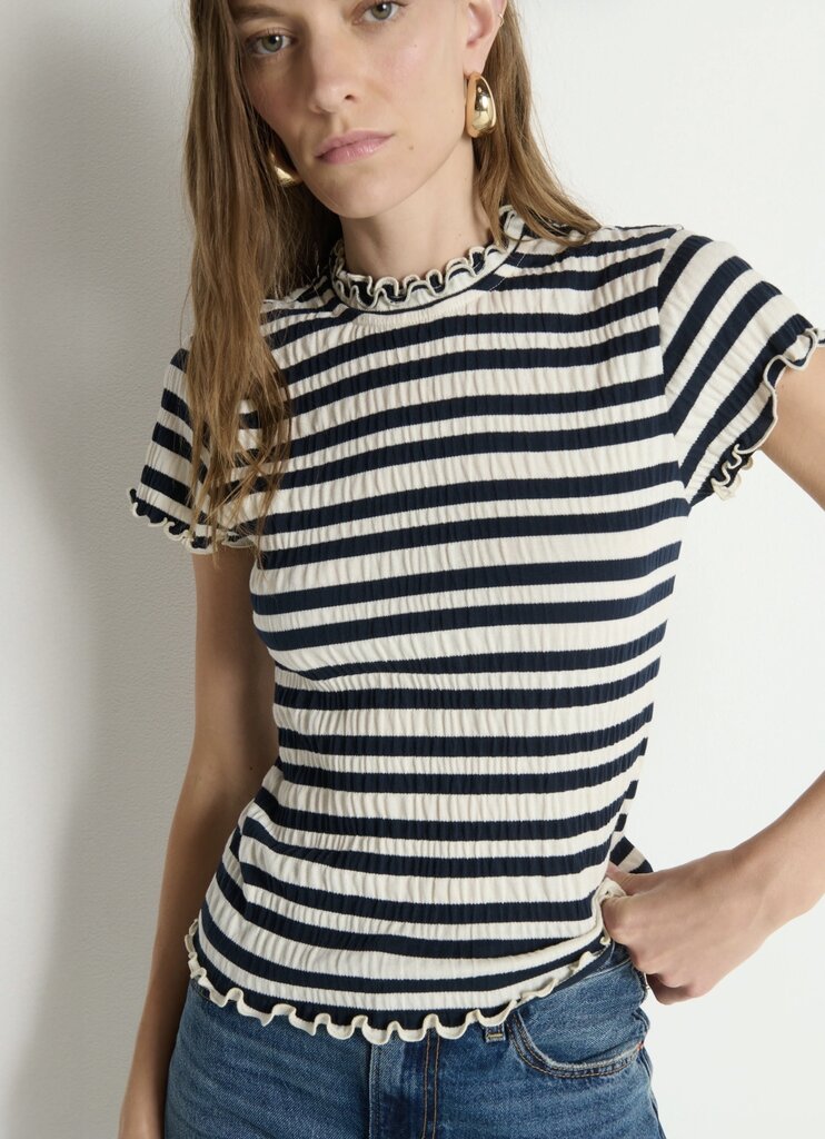 The Natalia Top pairs effortless charm with a French twist in jacquard crinkle jersey. With a ruffled mock neck and delicate cap sleeves, it’s a fitted knit that makes everyday dressing feel just a bit more romantic.