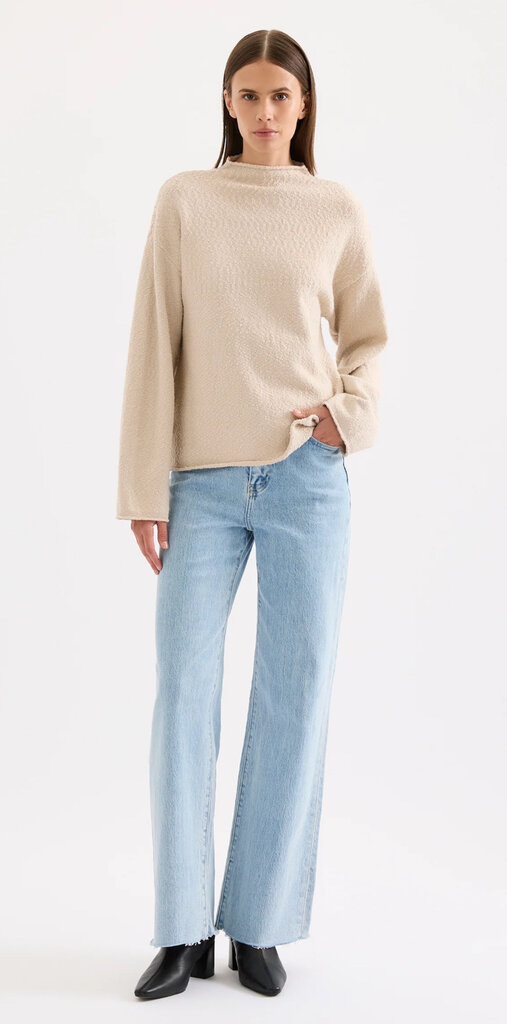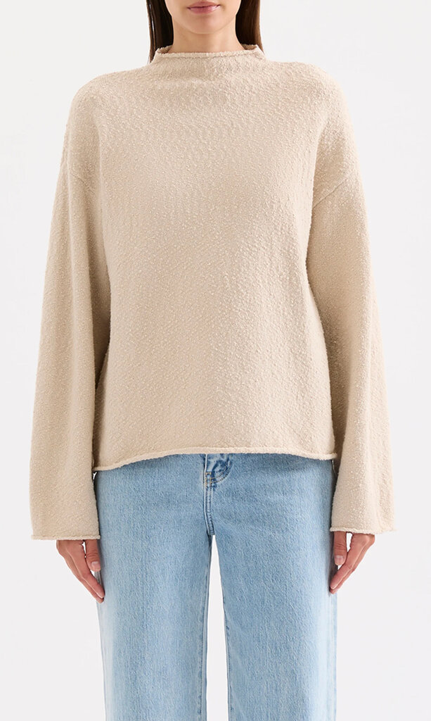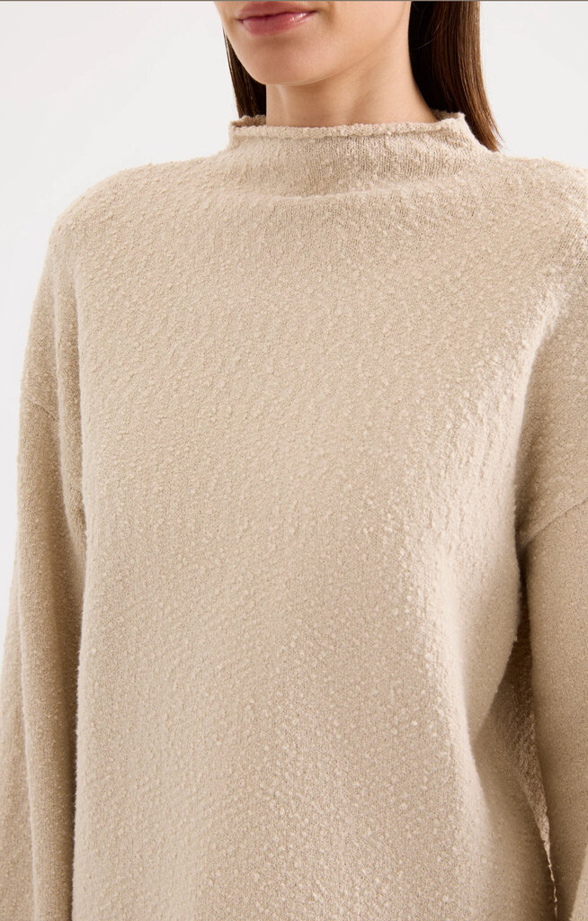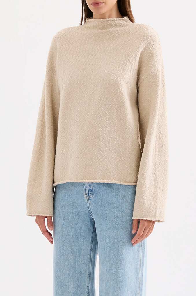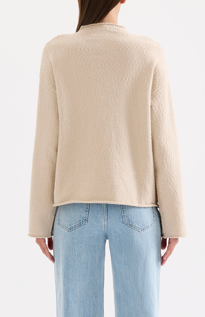 The Ordell Knit is made from a cotton blend textured boucle yarn with a dry and cool hand feel. The silhouette is relaxed with a high neck and length finishing at the hips. Features include a roll hem finish.
