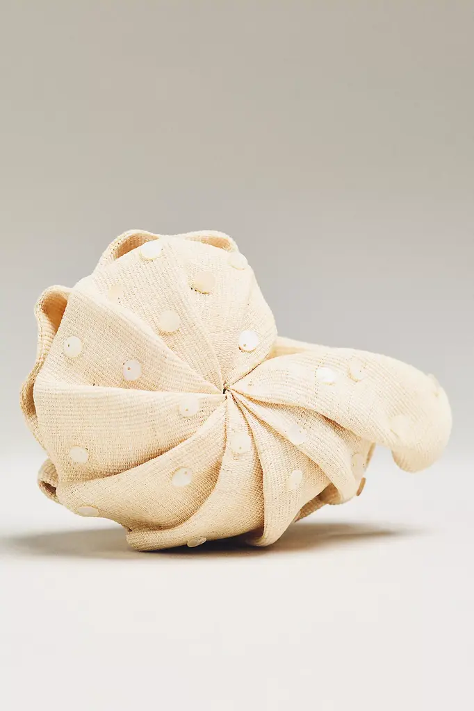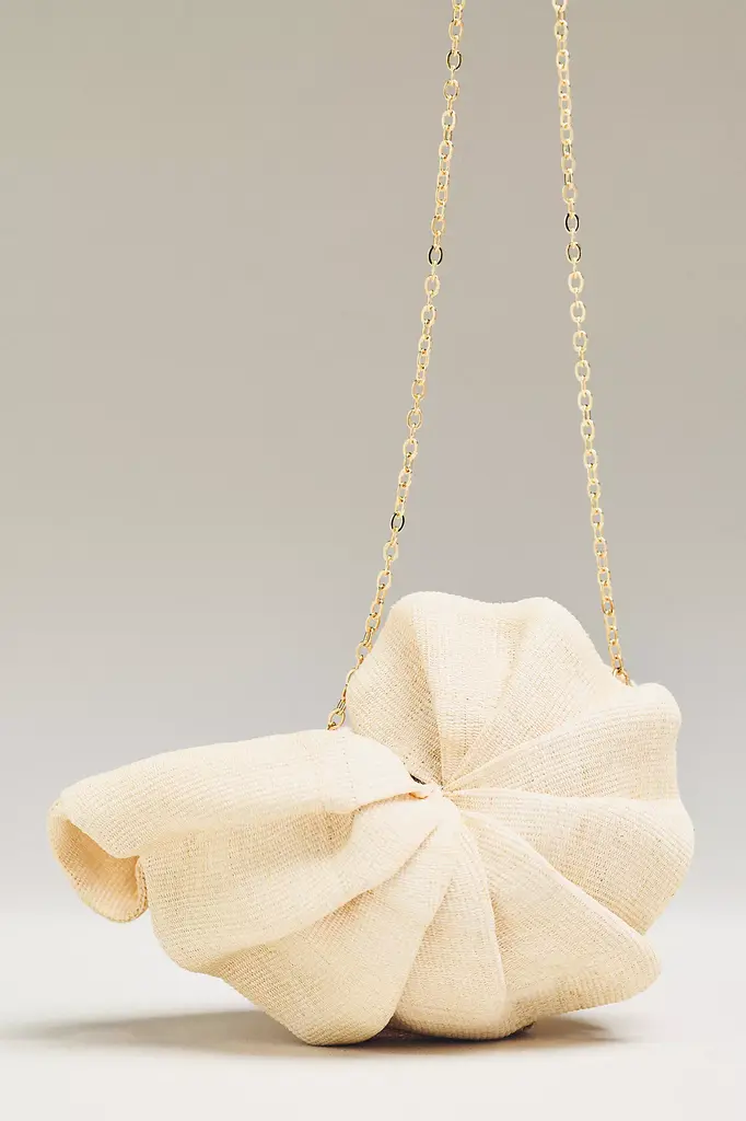 The perfect accessory for warm weather events and vacations, the POOLSIDE Origami Nautilus Clutch is a unique shell-shaped purse crafted with handwoven straw, featuring an removable chain strap.