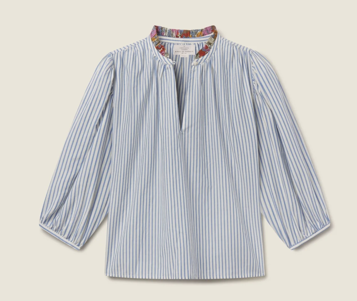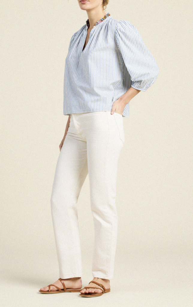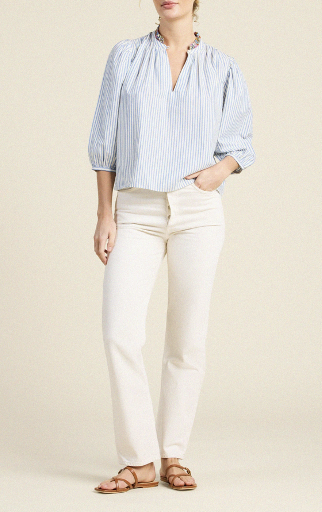 The Orly Blouse is a slightly cropped, billowy blouse with straight bottom hem, split v-neckline and buttoned crown collar. Gathered three-quarter length sleeves finished with delicate bindings.