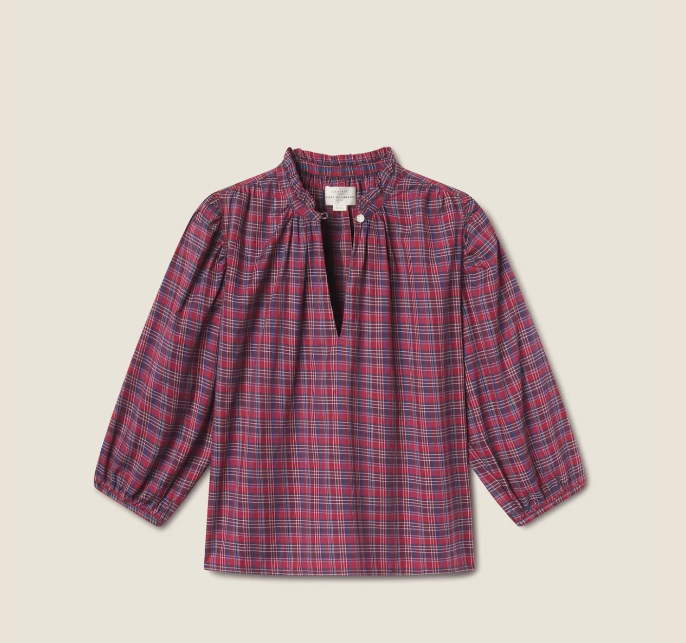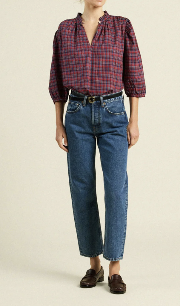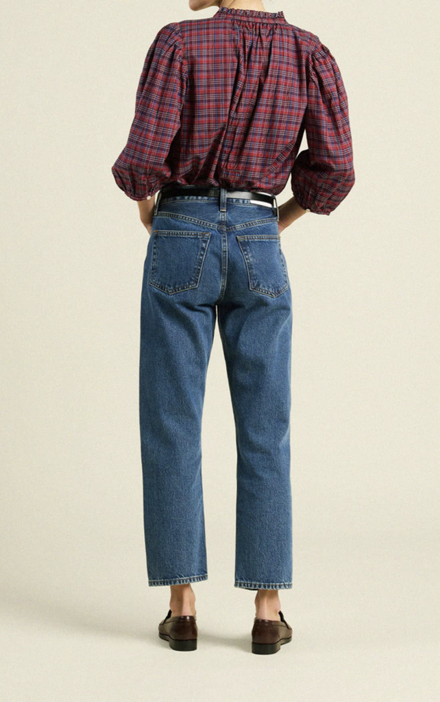 The Orly Blouse is a slightly cropped, billowy blouse with straight bottom hem, split v-neckline and buttoned crown collar. Gathered three-quarter length sleeves finished with delicate bindings. Includes our signature back detail with a gathered waist tab