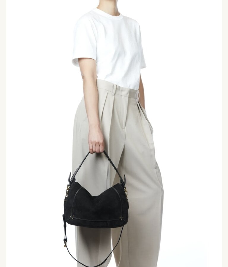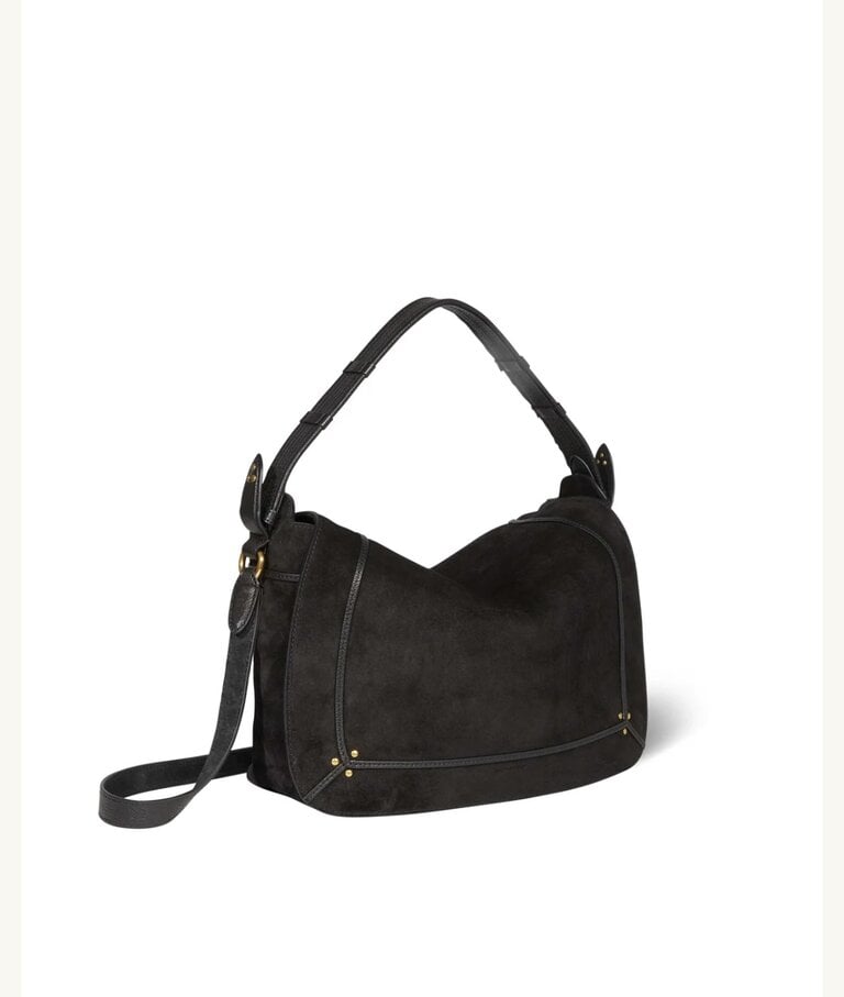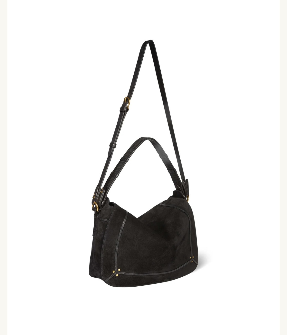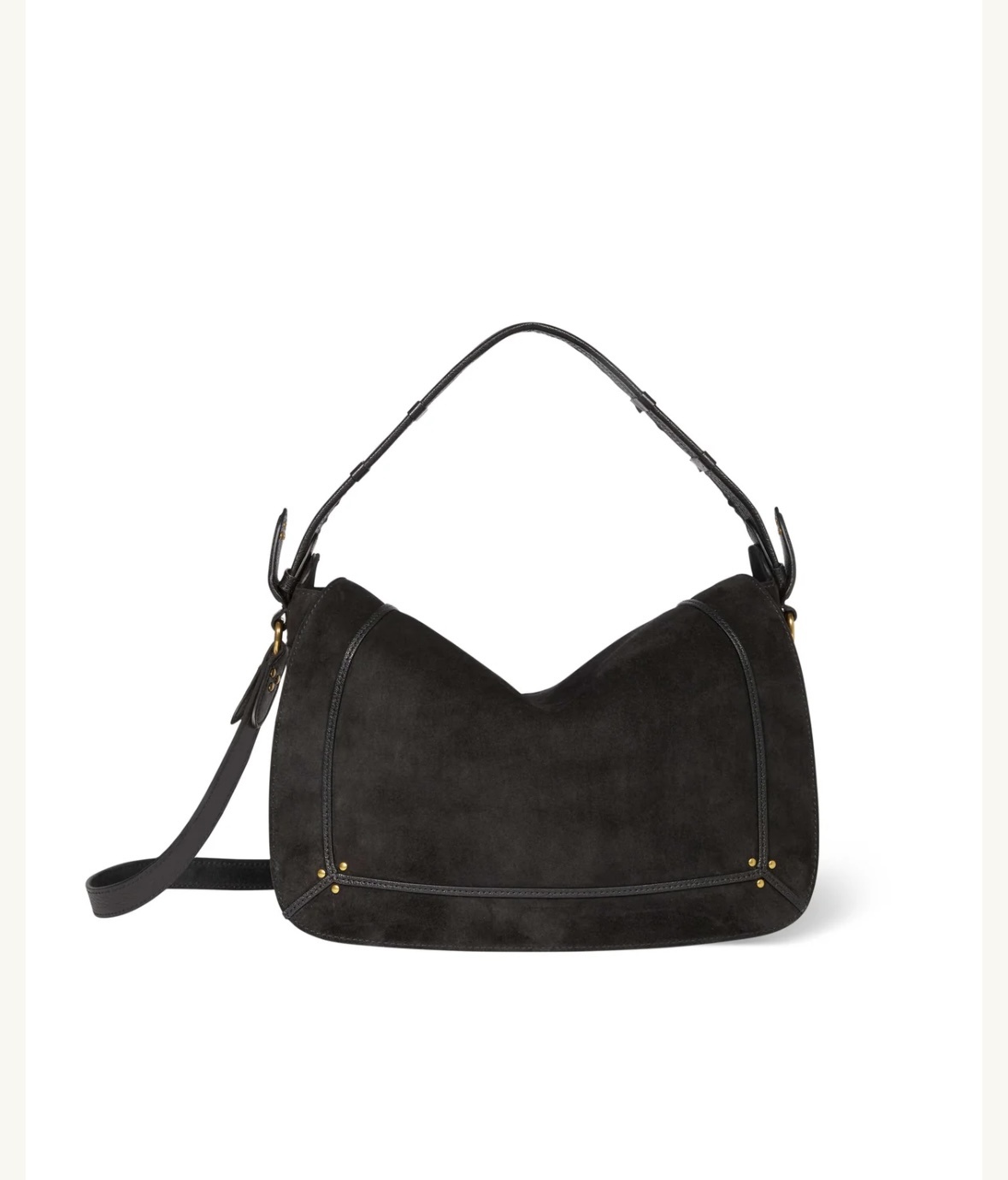 Shoulder bag, can be worn on the shoulder, crossbody, or by hand. It features a quilted leather handle and a long adjustable, removable strap. The closure is a magnetic leather flap adorned with stitched bands.