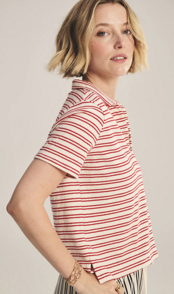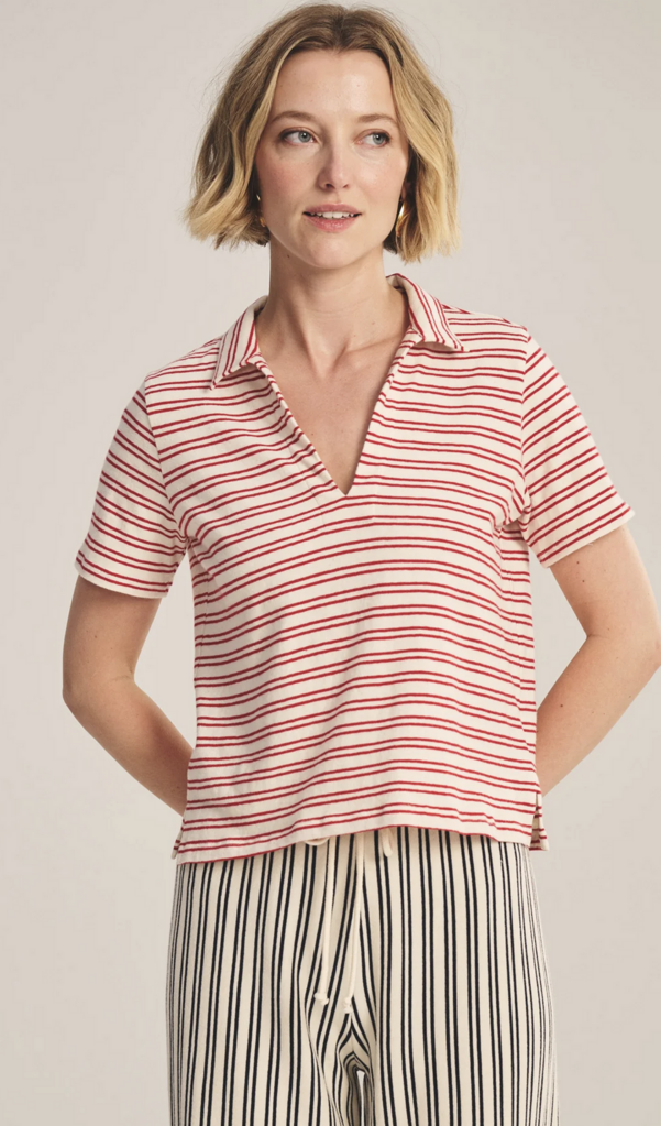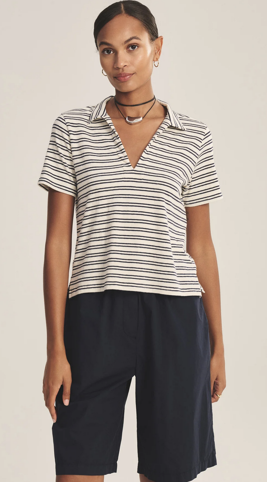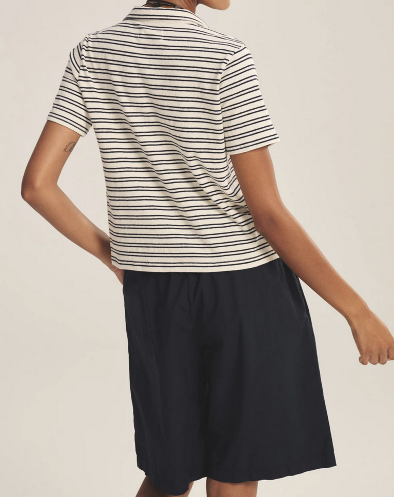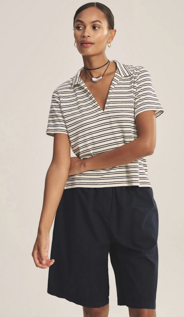 Crafted from yarn-dyed stripe cotton with subtle stretch, this style offers a polished take on a classic T-shirt polo. Featuring a V-neckline with a soft collar, cropped length, and side split hem, it balances relaxed ease with refined detail.