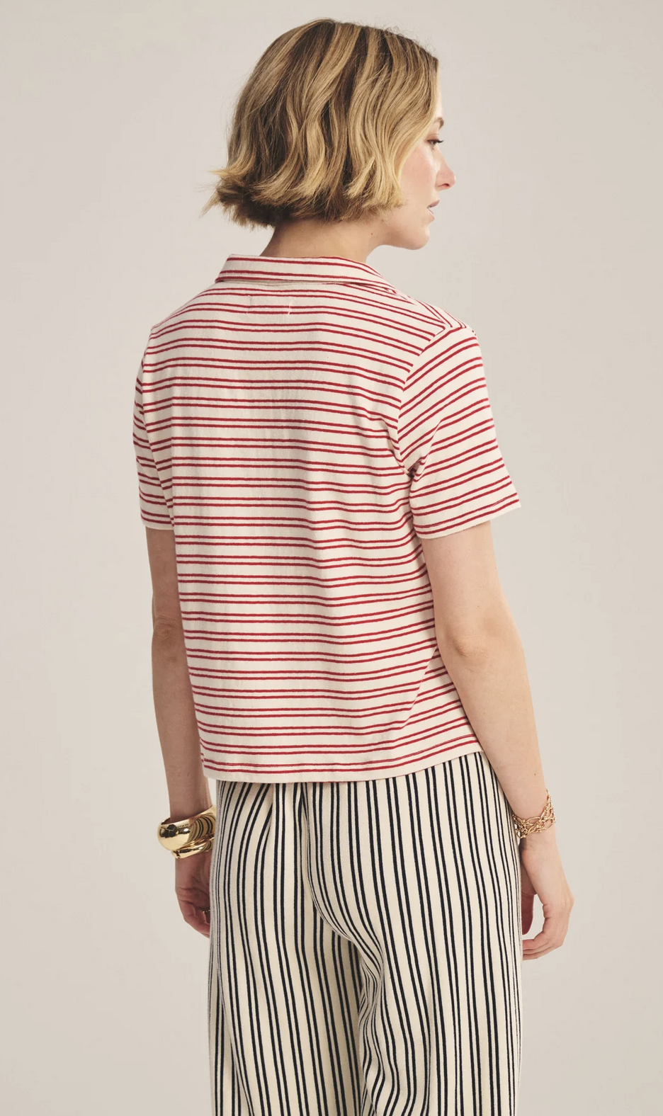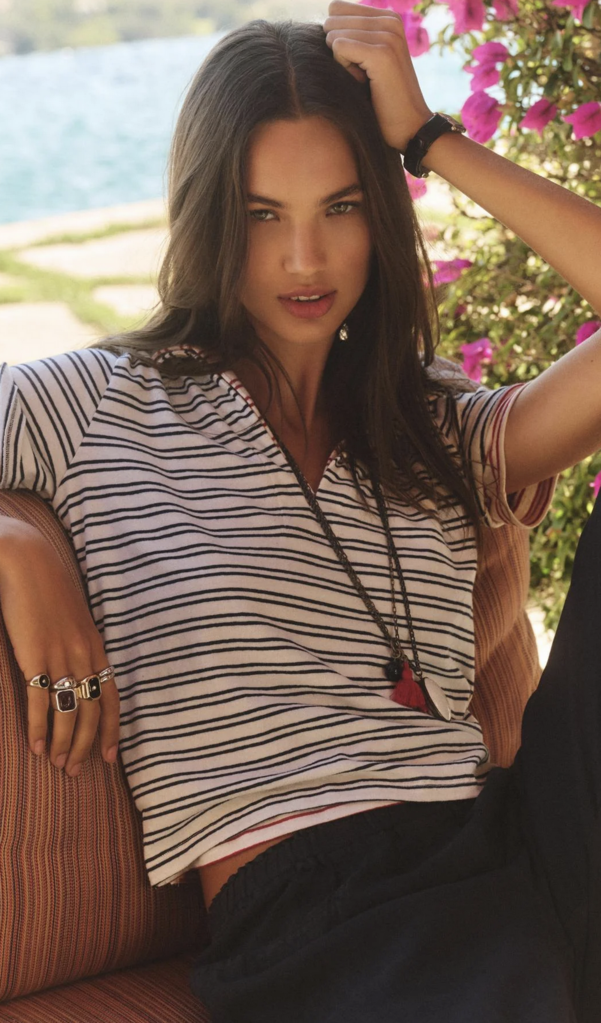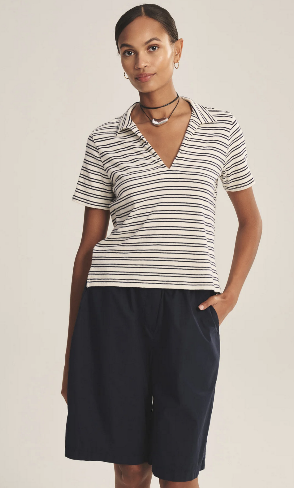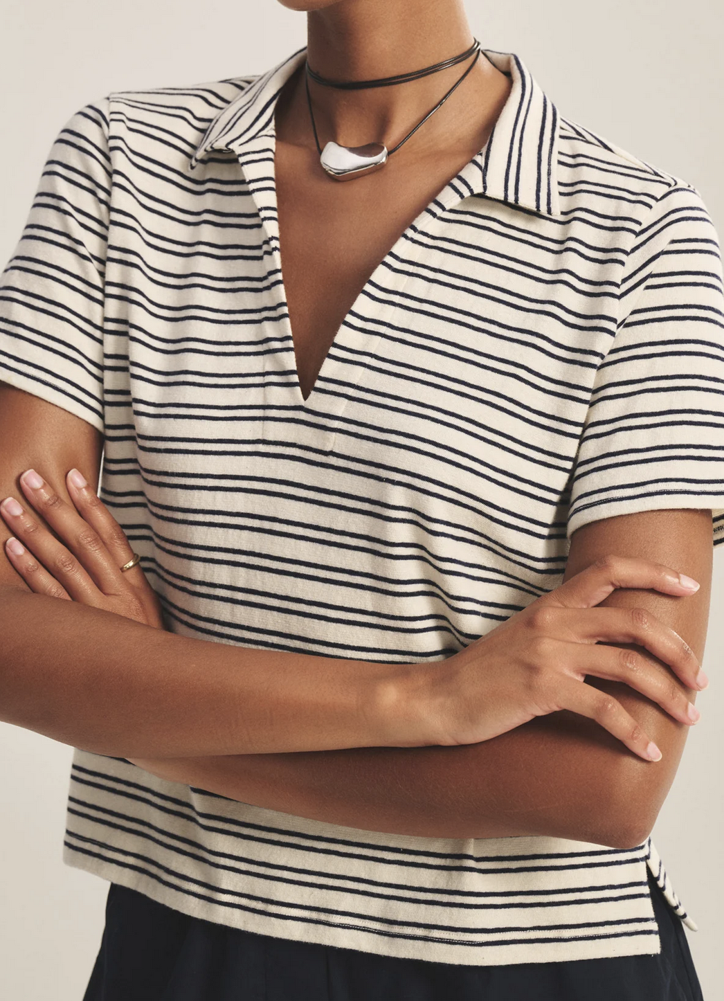 Crafted from yarn-dyed stripe cotton with subtle stretch, this style offers a polished take on a classic T-shirt polo. Featuring a V-neckline with a soft collar, cropped length, and side split hem, it balances relaxed ease with refined detail.