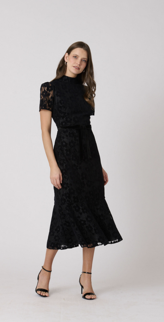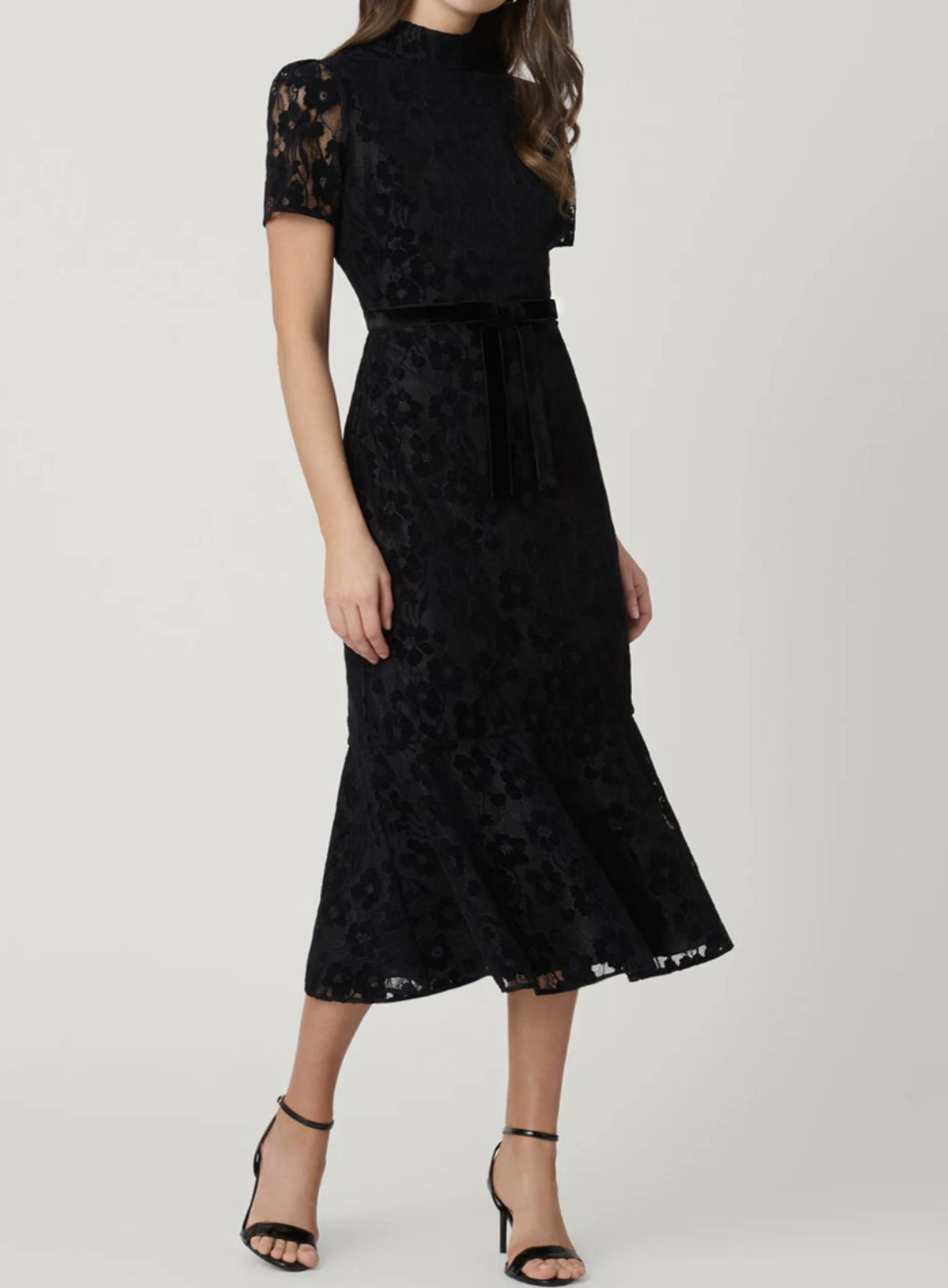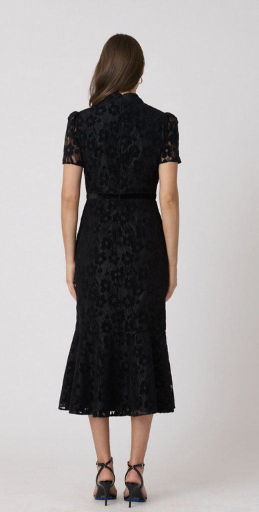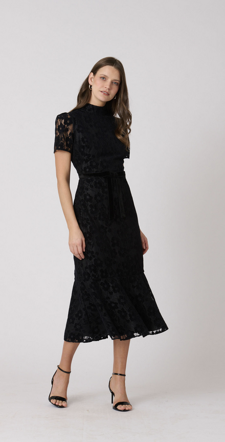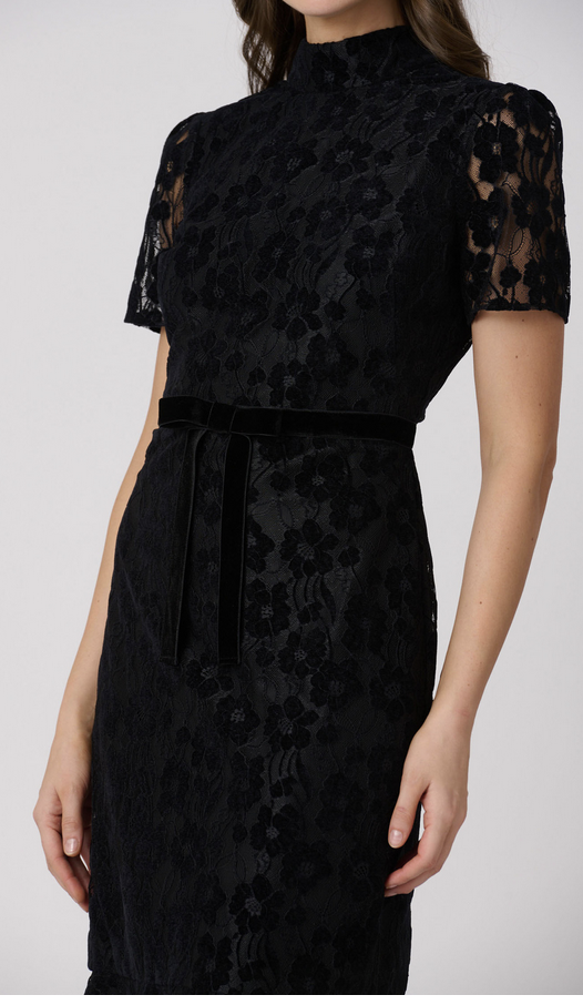 Chic black dress in intricate chenille lace. This style features a mock neck with sheer sleeves and an elegant velvet ribbon bow at the waist that is fixed. Bodice and skirt are lined. Center back has an invisible zipper closure.