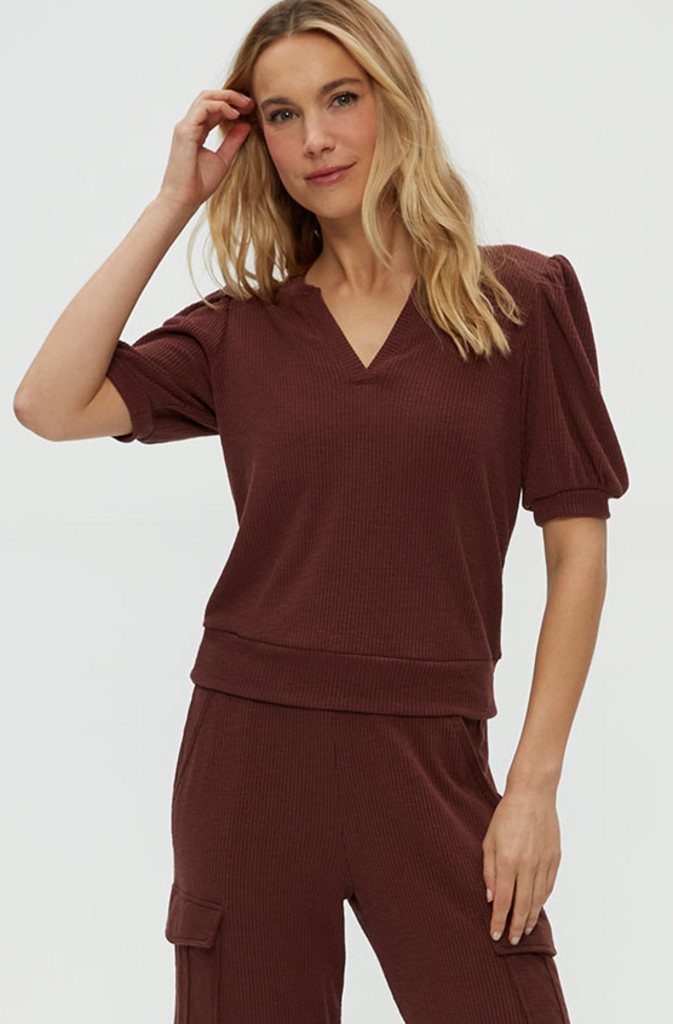 Pepper your look with feminine details. Get there with delicate and thoughtful accent like this subtle puff sleeve and a spliced neckline that bares just enough. This soft, ribbed knit top offers a body-skimming fit, with a wide hemline that stops just at the top of the waistband. Style this with tailored favorites or denim for a sweet balance.