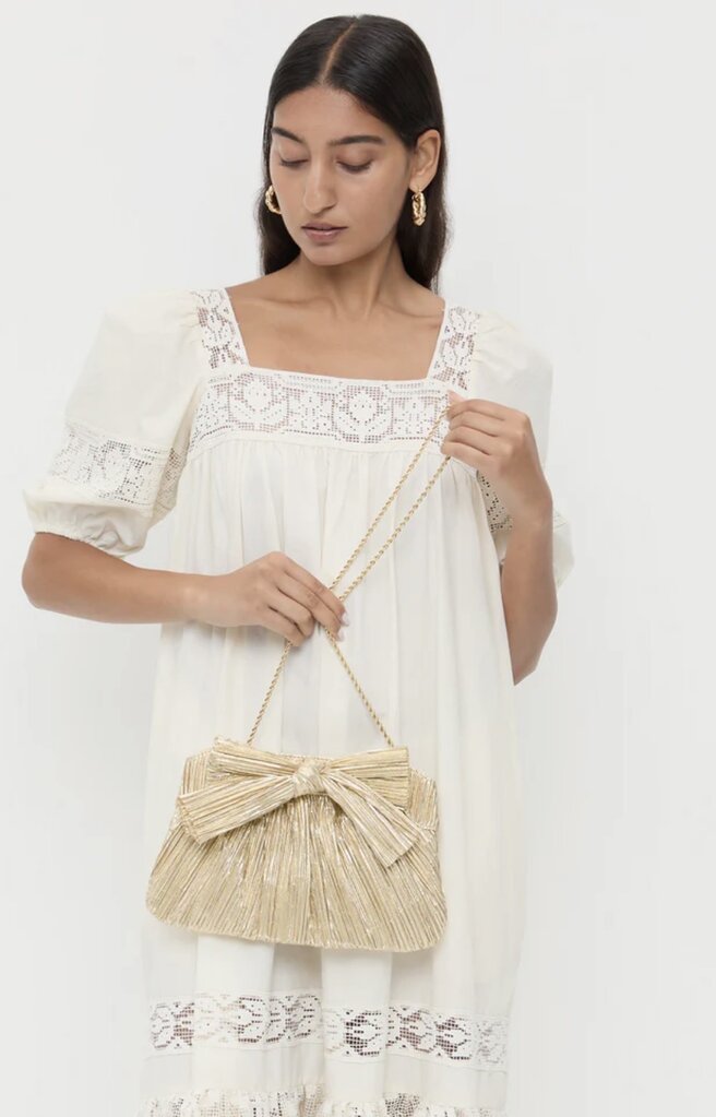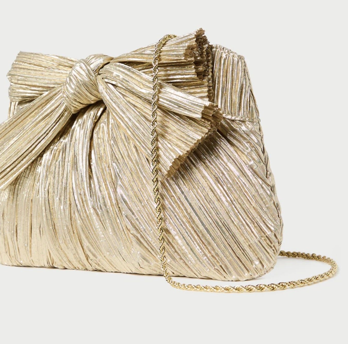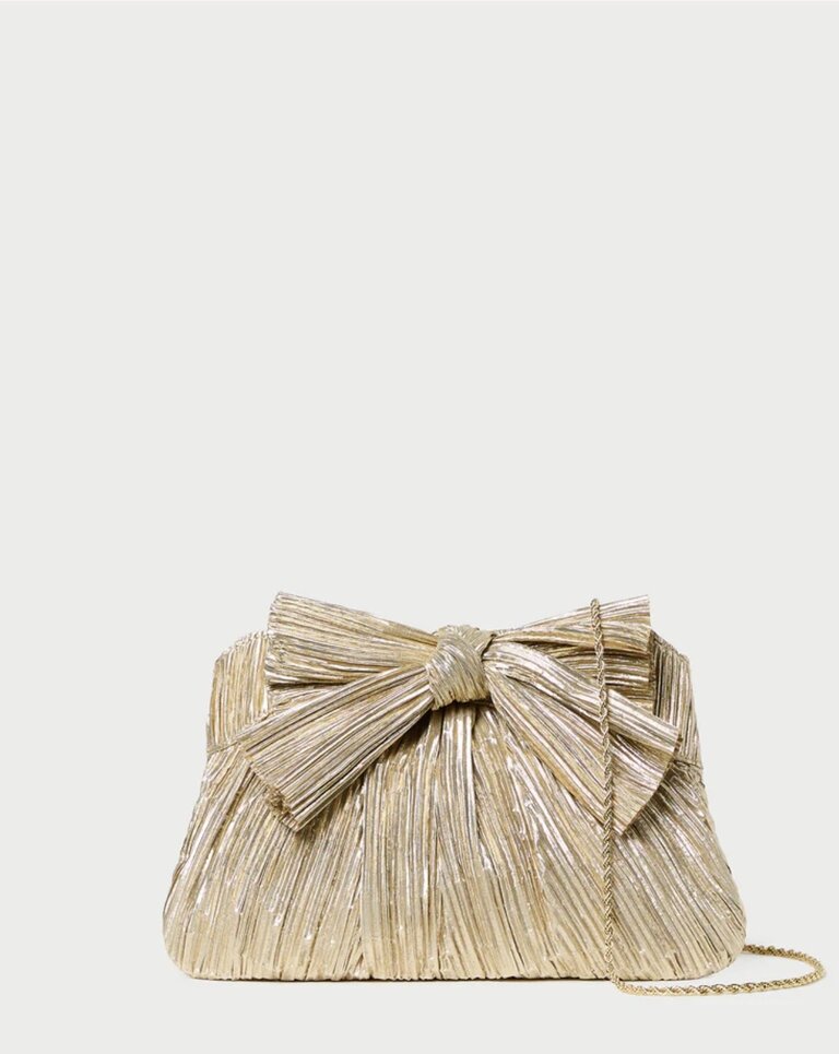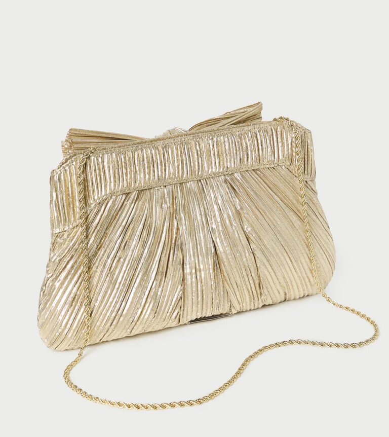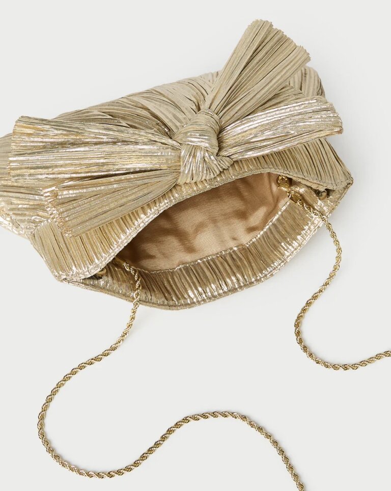 Pleated frame clutch with bow in gold pleated lamé. Fully lined with removable twisted gold metal chain strap.