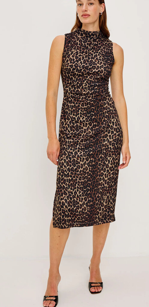 The Rebecca is a sleeveless midi dress with a sleek silhouette. A funnel neckline and ruched sides lend to its polished design.