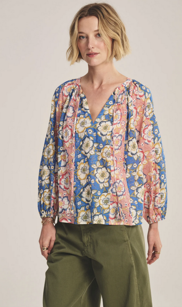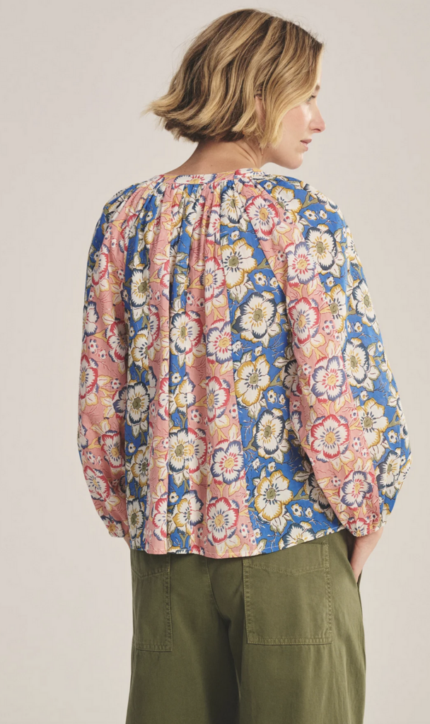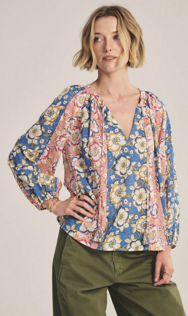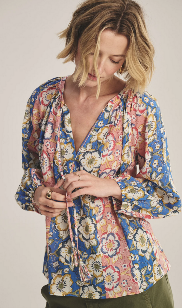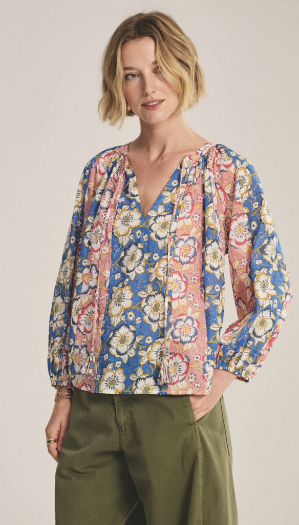 Offering a relaxed, breezy fit, this top is crafted from lightweight printed cotton for all-day comfort. It features a V-neckline with front ties, puffed sleeves with elastic cuffs, and pleat detailing along the back for subtle, feminine interest.