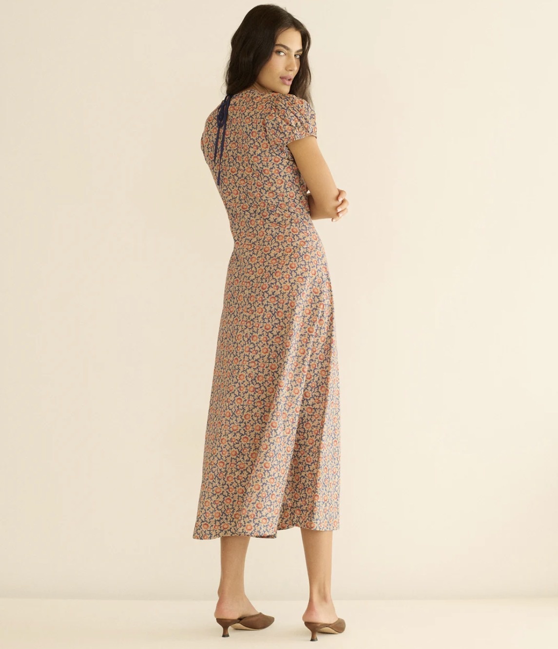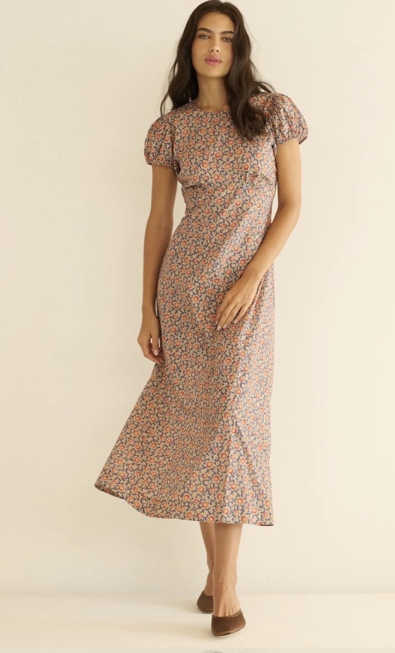 This romantic midi features gently puffed short sleeves, pointed underbust seams for structure, and a fitted waist that fastens with an invisible side seam zipper. Grosgrain ribbon ties into a pretty bow at the nape of the neck.