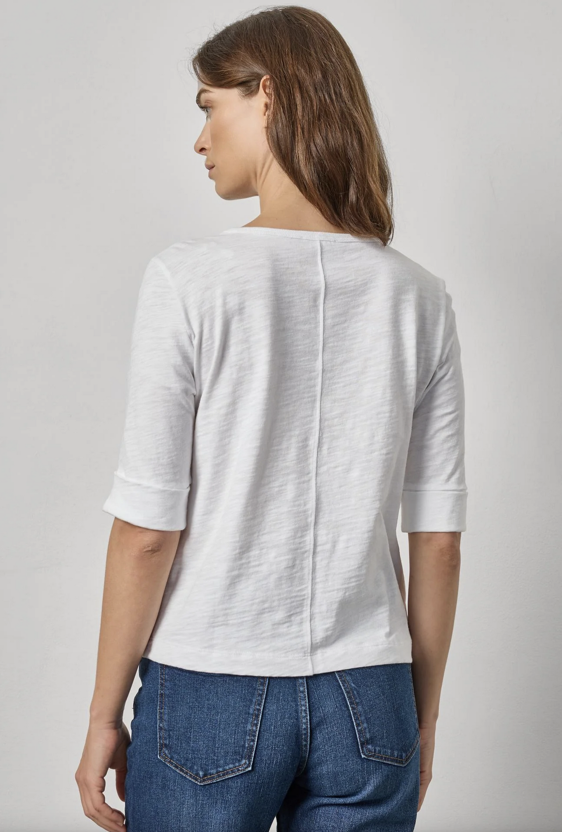 Designed with cuffed sleeves and perfect elbow-length coverage, it features a straight body shape and a small rib trim around the split neckline. Simple yet elevated, this is the tee you'll reach for again and again.