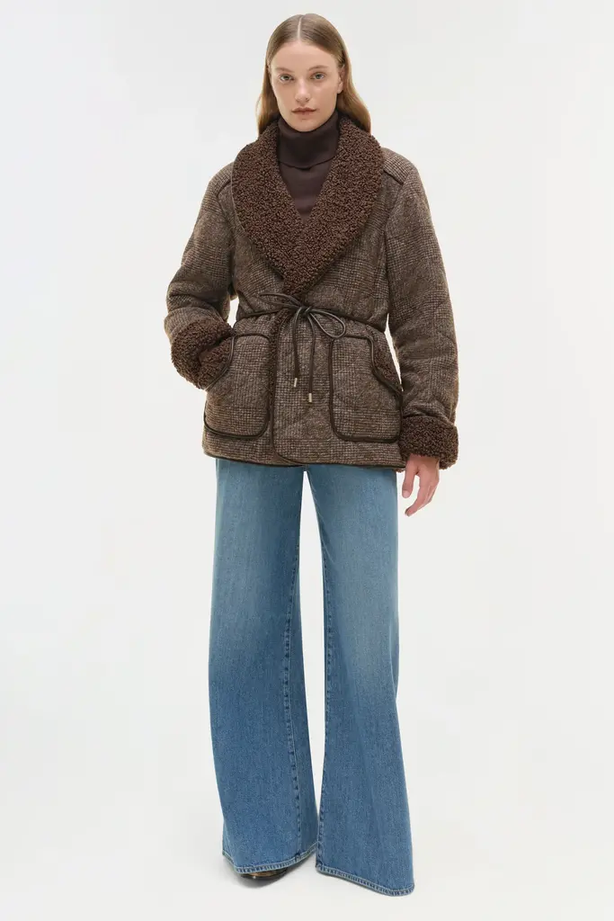 A cozy quilted jacket constructed from faux sherpa with long sleeves, tie front closure, and front pockets.