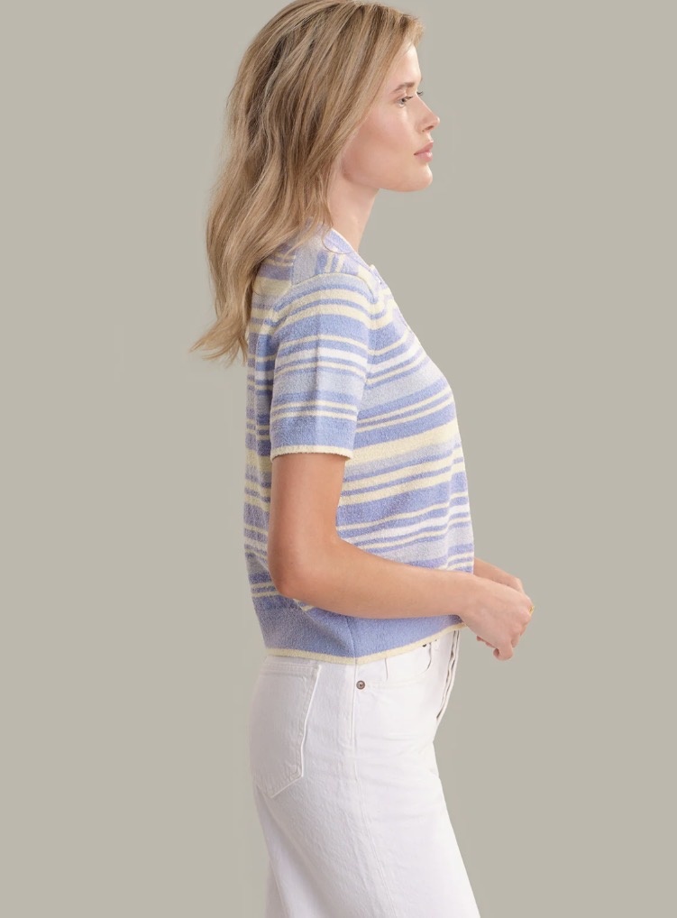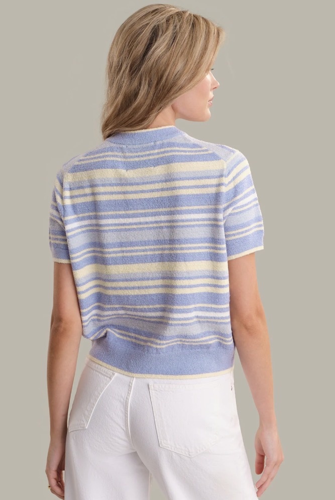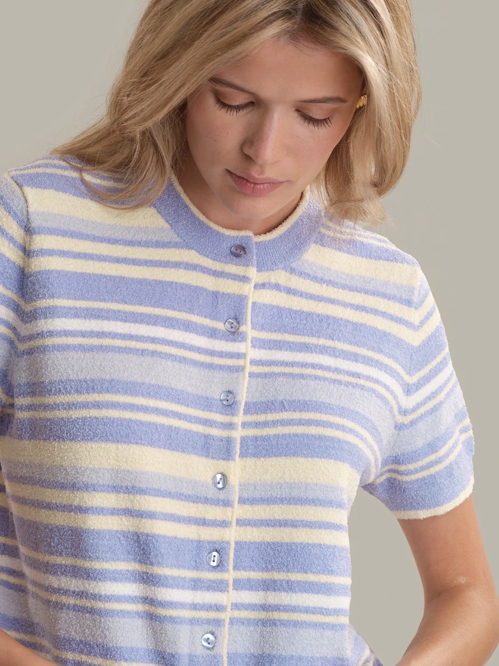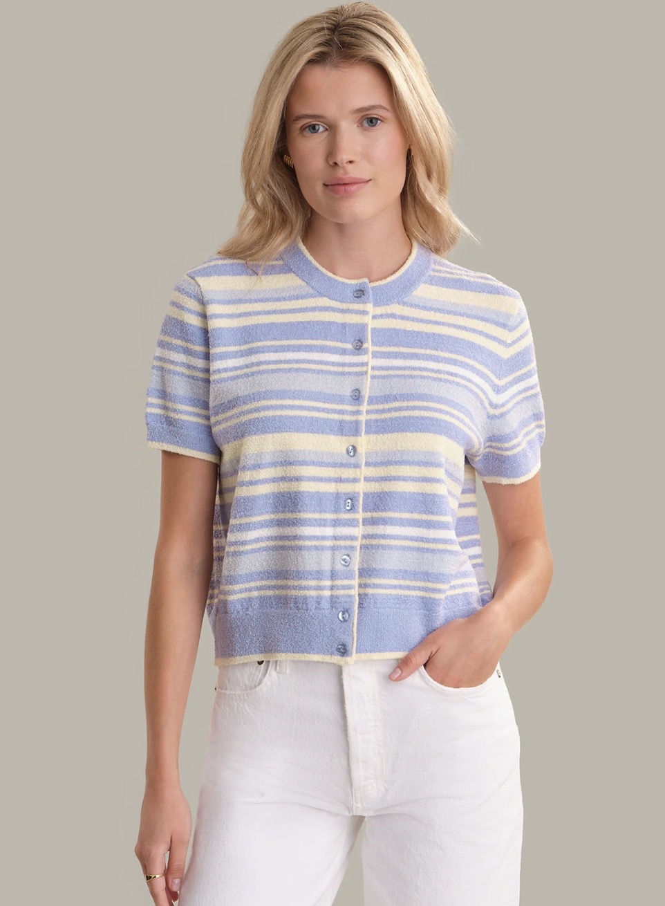 This striped short sleeve cardigan brings a light, polished feel to everyday outfits. The button-front design makes it easy to style solo or layered, pairing effortlessly with denim, skirts, or tailored bottoms.