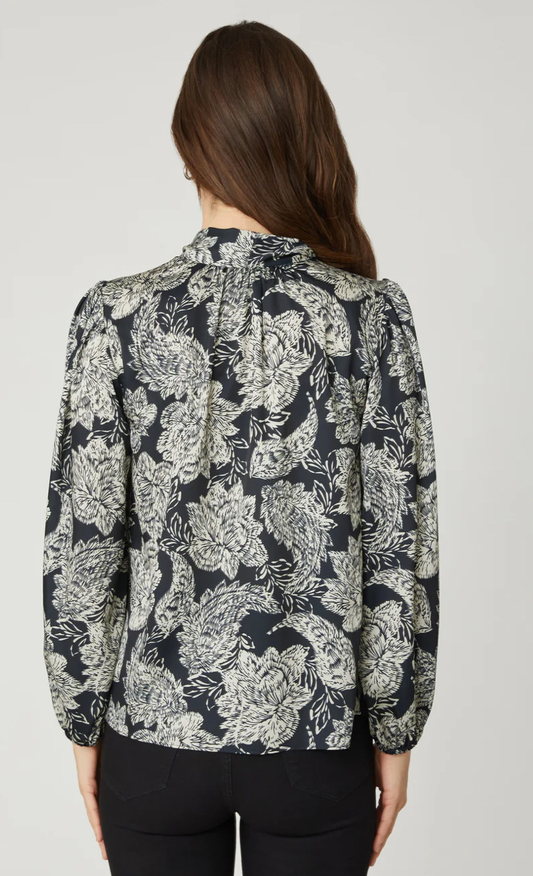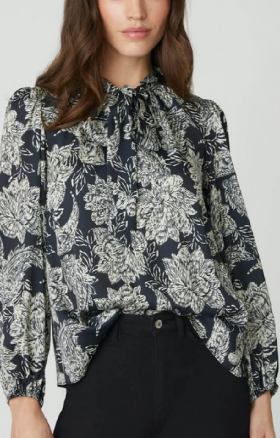 Floral printed satin blouse with a chic tie-neck detail. The silhouette features a shirred easy body shape and balloon sleeves with encased elastic at the edge.