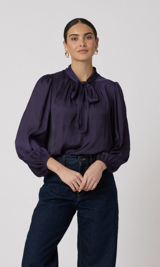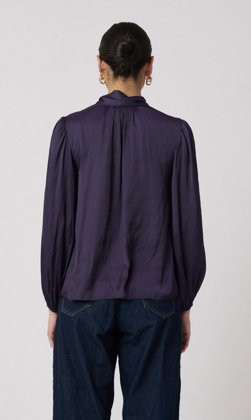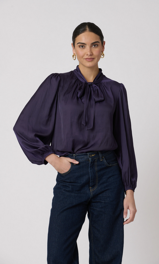 Classic tie-neck top with shirring along the neckline to give it a nice shape. This soft and lightweight satin top has full-length sleeves with an elastic opening and a slightly curved hemline.