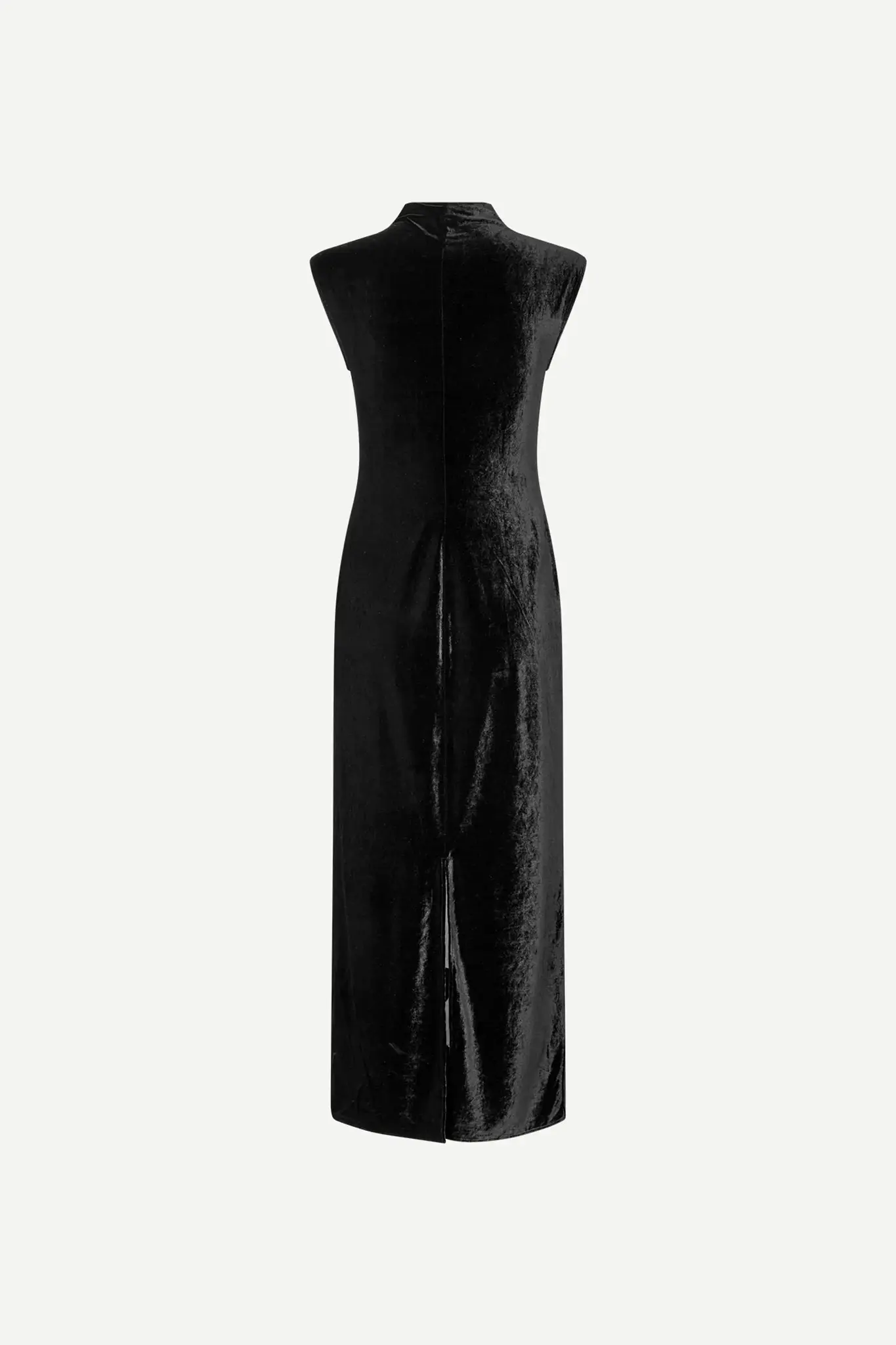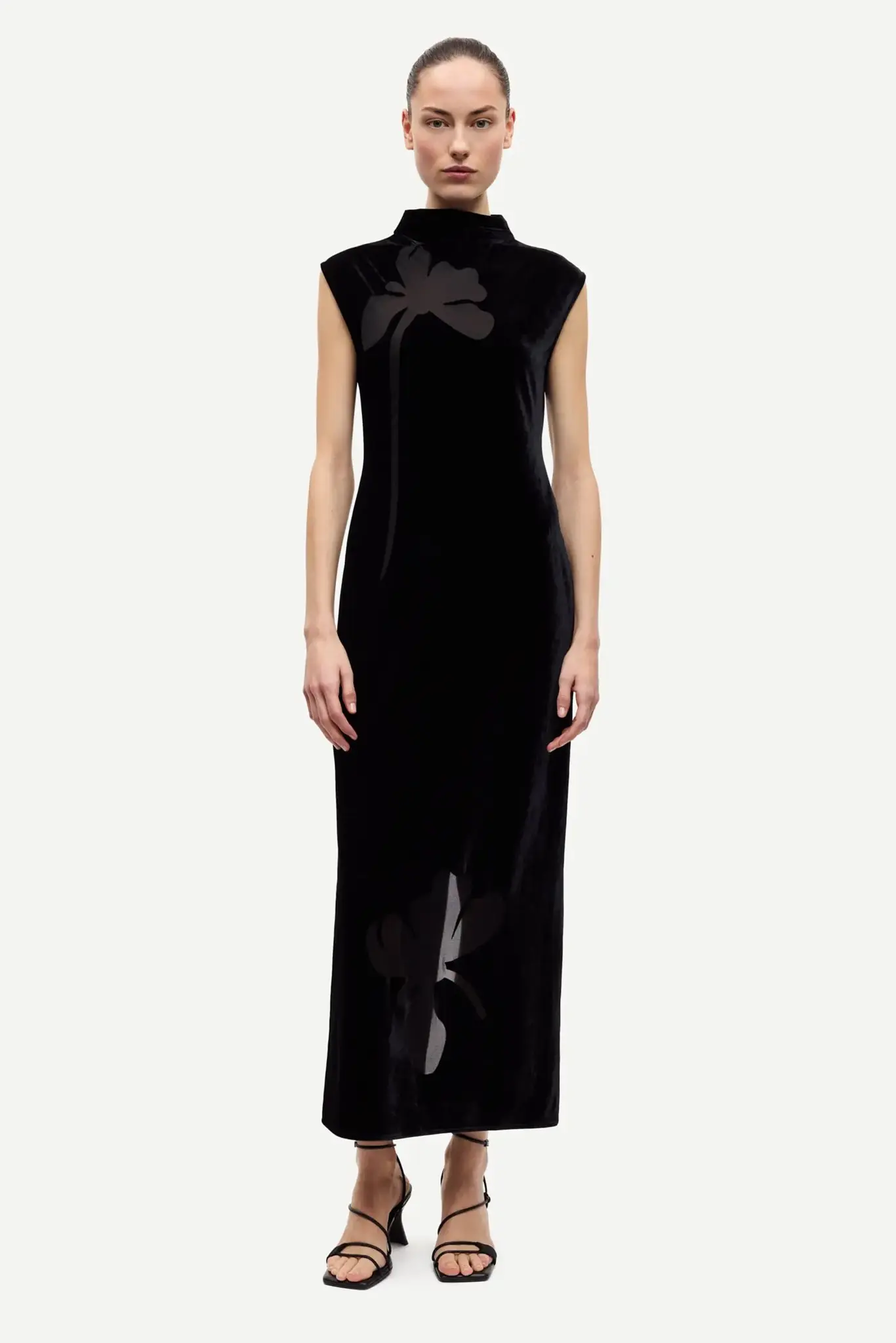 Velvet maxi dress with a slim fit and sheer floral detailing. High neck. Slit at the back hem. Main material made from an elastic recycled polyester blend.