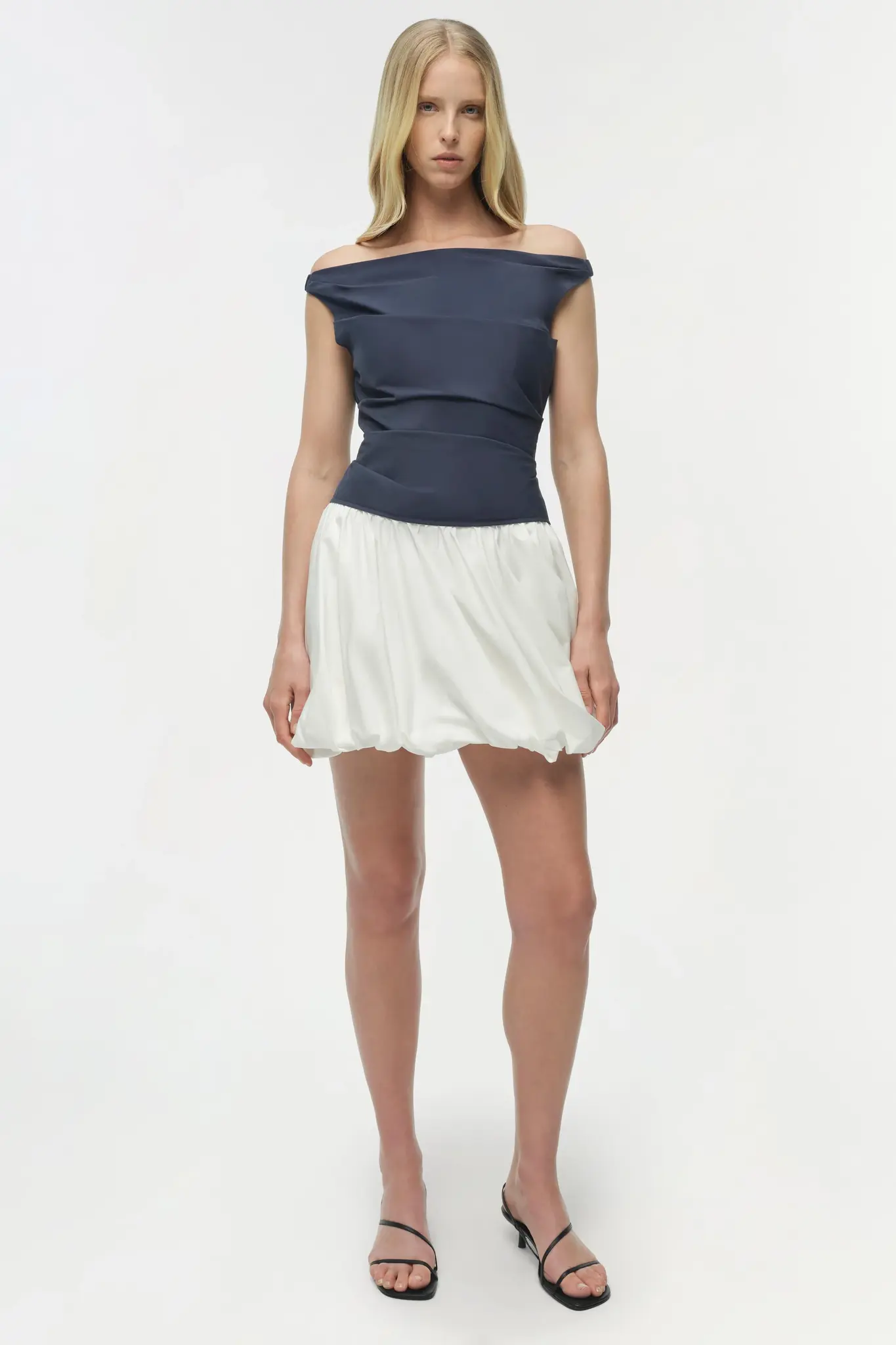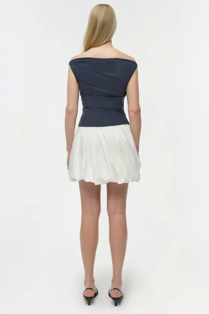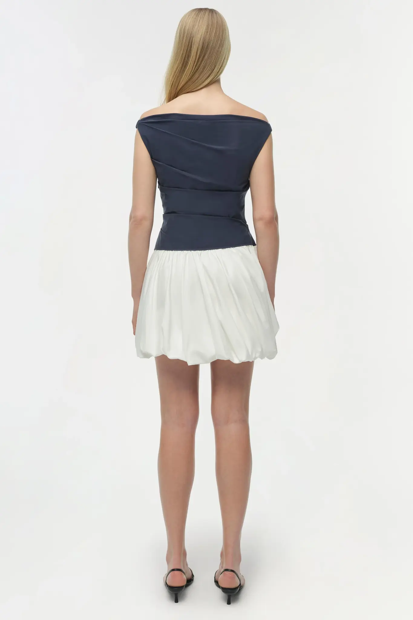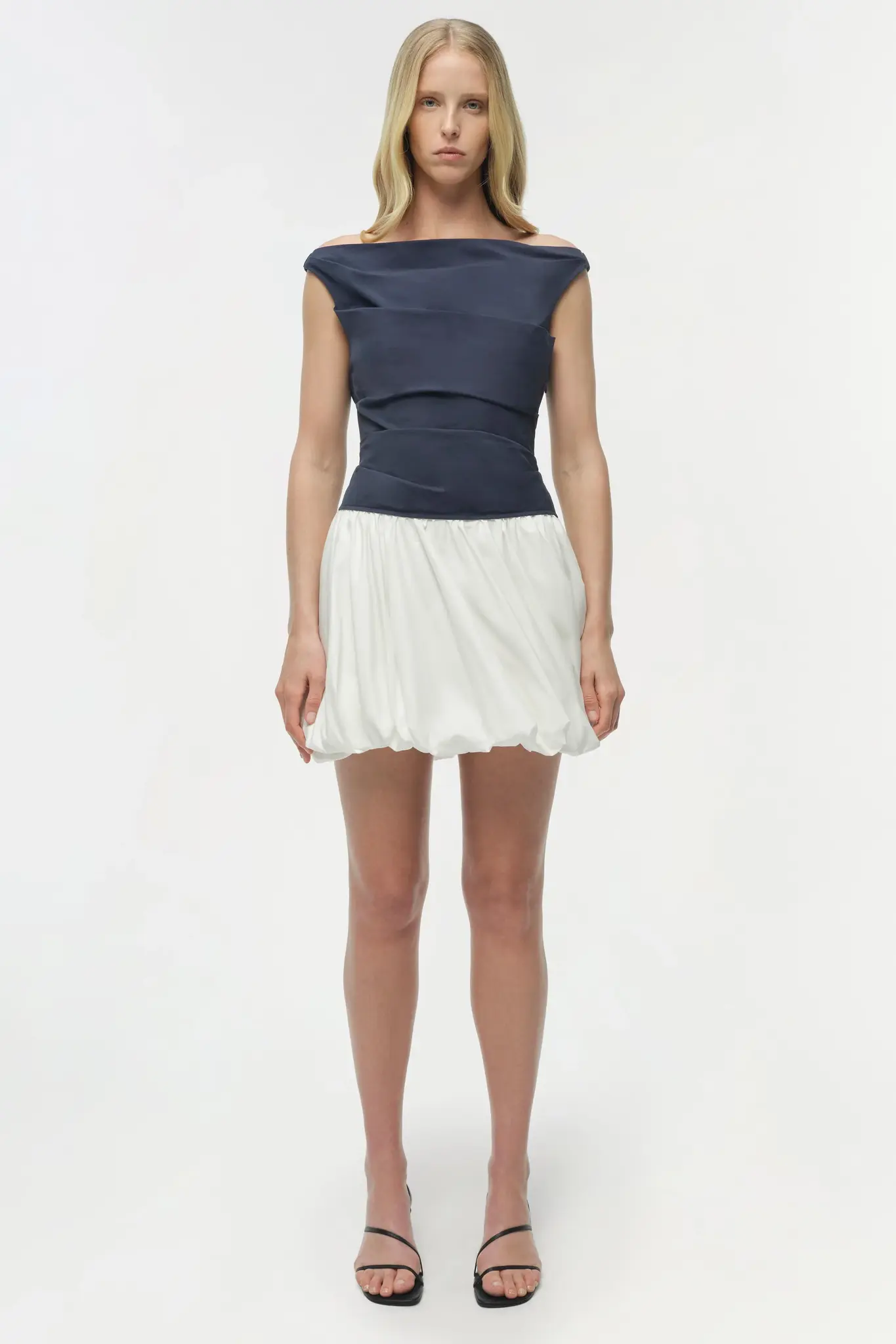 The Salina Bubble Mini Dress in Midnight Multi. This bubble mini dress is crafted from crisp cotton poplin and designed with a clean boat neckline, a softly ruched bodice and a voluminous skirt.