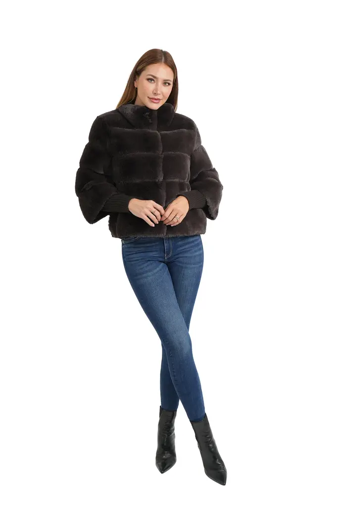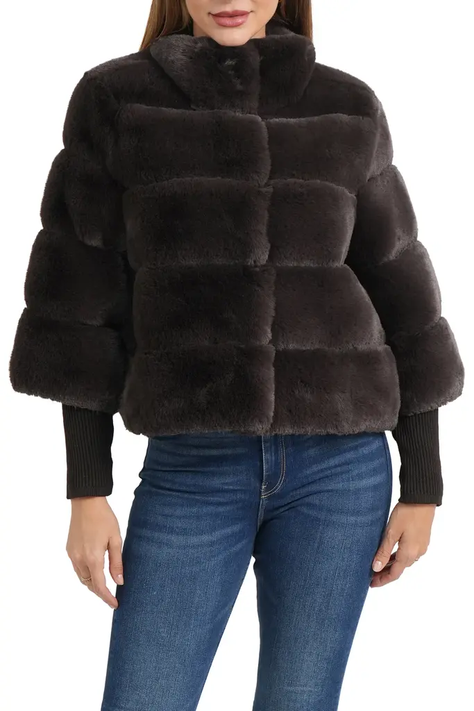 Samantha faux fur paneled jacket, stand collar, snap front closure, front slit pockets, paneled faux fur, ribbed knit sleeve cuff, relaxed fit.